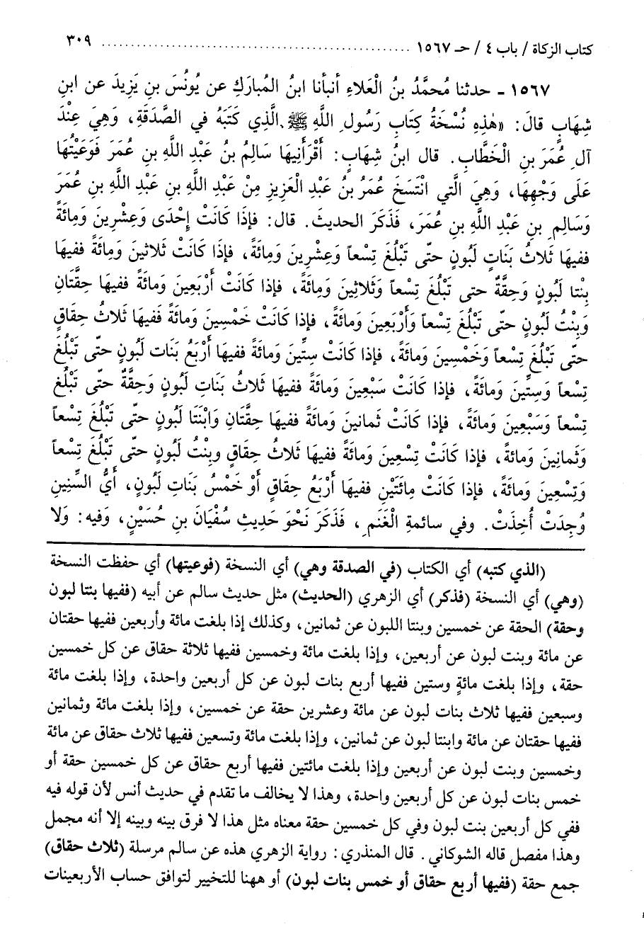 [1570] (الَّذِي كَتَبَهُ) أَيِ الْكِتَابَ (فِي الصَّدَقَةِ وَهِيَ) أَيِ النُّسْخَةُ (فَوَعَيْتُهَا) أَيْ حَفِظْتُ النُّسْخَةَ (وَهِيَ) أَيِ النُّسْخَةُ (فَذَكَرَ) أَيِ الزُّهْرِيُّ (الْحَدِيثَ) مِثْلَ حَدِيثِ سَالِمٍ عَنْ أَبِيهِ (فَفِيهَا بِنْتَا لَبُونٍ وَحِقَّةٌ) الْحِقَّةُ عَنْ خَمْسِينَ وَبِنْتَا اللَّبُونِ عَنْ ثَمَانِينَ وَكَذَلِكَ إِذَا بَلَغَتْ مِائَةً وَأَرْبَعِينَ فَفِيهَا حِقَّتَانِ عَنْ مِائَةٍ وَبِنْتِ لَبُونٍ عَنْ أَرْبَعِينَ وَإِذَا بَلَغَتْ مِائَةً وَخَمْسِينَ فَفِيهِ ثَلَاثُ حِقَاقٍ عَنْ كُلِّ خَمْسِينَ حِقَّةٌ وَإِذَا بَلَغَتْ مِائَةً وَسِتِّينَ فَفِيهَا أَرْبَعُ بَنَاتِ لَبُونٍ عَنْ كُلِّ أَرْبَعِينَ وَاحِدَةٌ وَإِذَا بَلَغَتْ مِائَةً وَسَبْعِينَ فَفِيهَا ثلاث بنات لبون عن مائة وعشرين حقة عَنْ خَمْسِينَ وَإِذَا بَلَغَتْ مِائَةً وَثَمَانِينَ فَفِيهَا حِقَّتَانِ عَنْ مِائَةٍ وَابْنَتَا لَبُونٍ عَنْ ثَمَانِينَ وَإِذَا بَلَغَتْ مِائَةً وَتِسْعِينَ فَفِيهَا ثَلَاثُ حِقَاقٍ عَنْ مِائَةٍ وَخَمْسِينَ وَبِنْتُ لَبُونٍ عَنْ أَرْبَعِينَ وَإِذَا بَلَغَتْ مِائَتَيْنِ فَفِيهَا أَرْبَعُ حِقَاقٍ عَنْ كُلِّ خَمْسِينَ حِقَّةٌ أَوْ خَمْسُ بَنَاتِ لَبُونٍ عَنْ كُلِّ أَرْبَعِينَ وَاحِدَةٌ وَهَذَا لَا يُخَالِفُ مَا تَقَدَّمَ فِي حَدِيثِ أَنَسٍ لِأَنَّ قَوْلَهُ فِيهِ فَفِي كُلِّ أَرْبَعِينَ بِنْتُ لَبُونٍ وَفِي كُلِّ خَمْسِينَ حِقَّةٌ مَعْنَاهُ مِثْلُ هَذَا لَا فَرْقَ بَيْنَهُ وَبَيْنَهُ إِلَّا أَنَّهُ مُجْمَلٌ وَهَذَا مُفَصَّلٌ قَالَهُ الشَّوْكَانِيُّ
