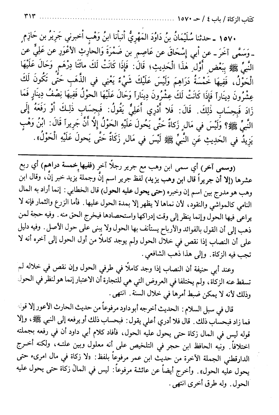 [1573] (وسمى آخر) أي سمى بن وَهْبٍ مَعَ جَرِيرٍ رَجُلًا آخَرَ (فَفِيهَا خَمْسَةُ دَرَاهِمَ) أَيْ رُبُعُ عُشْرِهَا (إِلَّا أَنَّ جَرِيرًا قال بن وَهْبٍ يَزِيدُ) لَفْظُ جَرِيرٍ اسْمُ إِنَّ وَجُمْلَةُ يزيد خبر إن وقال بن وَهْبٍ هُوَ مُدْرَجٌ بَيْنَ اسْمِ إِنَّ وَخَبَرِهِ (حَتَّى يَحُولَ عَلَيْهِ الْحَوْلُ) قَالَ الْخَطَّابِيُّ إِنَّمَا أَرَادَ بِهِ الْمَالَ النَّامِيَ كَالْمَوَاشِي وَالنُّقُودِ لِأَنَّ نَمَاهَا لَا يَظْهَرُ إِلَّا بِمُدَّةِ الْحَوْلِ عَلَيْهَا