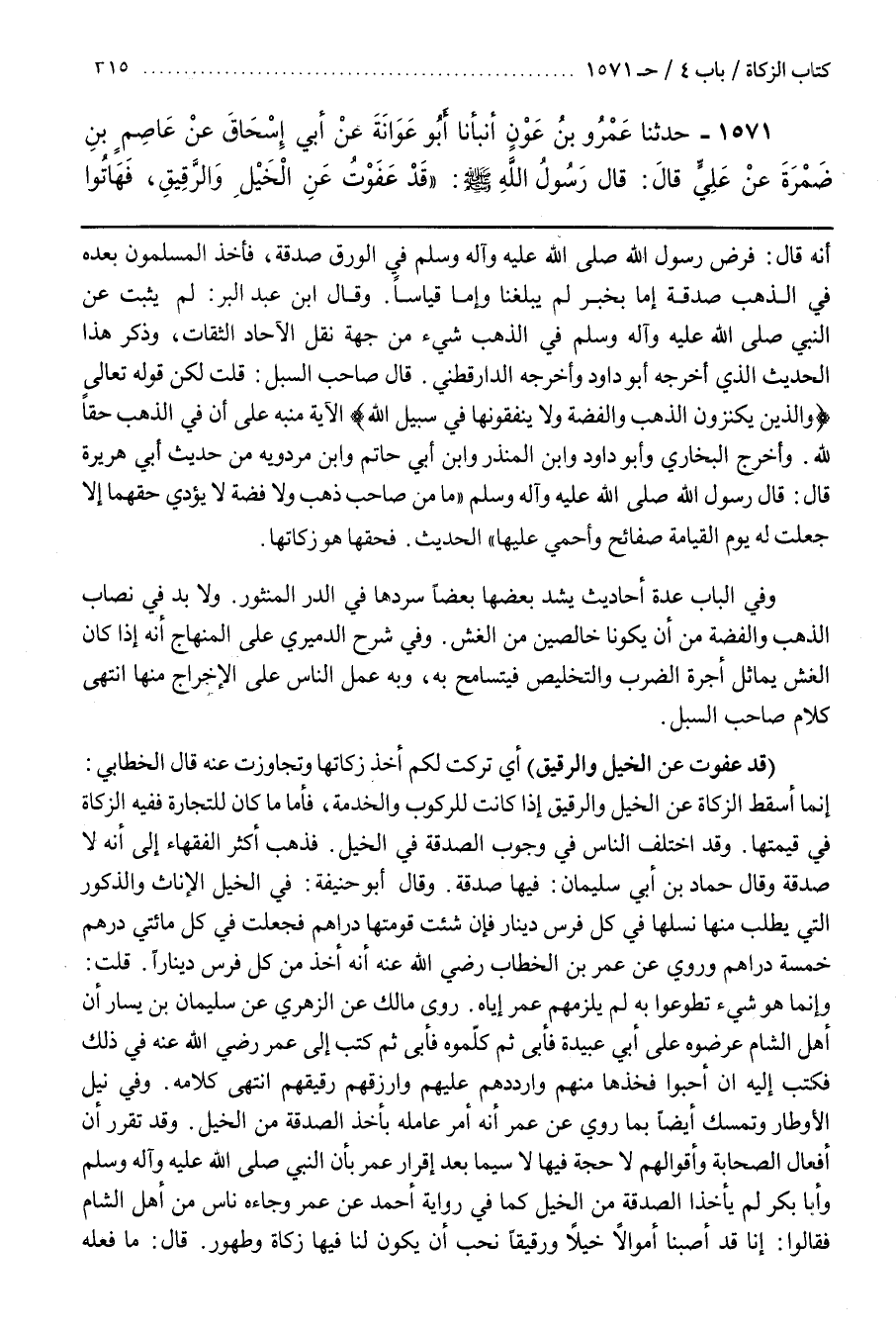 وَفِي نَيْلِ الْأَوْطَارِ وَتَمَسَّكَ أَيْضًا بِمَا رُوِيَ عَنْ عُمَرَ أَنَّهُ أَمَرَ عَامِلَهُ بِأَخْذِ الصَّدَقَةِ مِنَ الْخَيْلِ