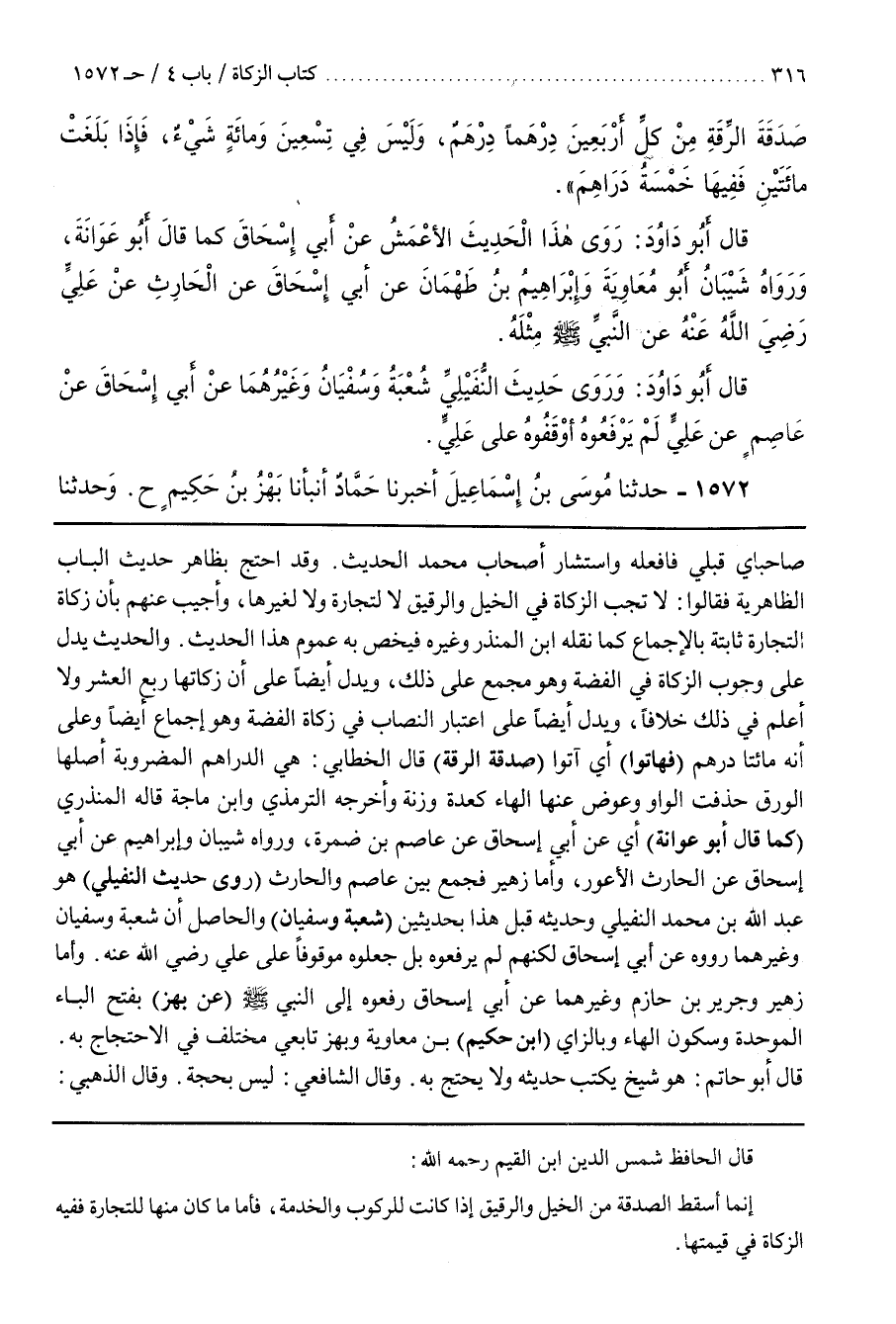 وَالْحَدِيثُ يَدُلُّ عَلَى وُجُوبِ الزَّكَاةِ فِي الْفِضَّةِ وَهُوَ مُجْمَعٌ عَلَى ذَلِكَ وَيَدُلُّ أَيْضًا عَلَى أَنَّ زَكَاتَهَا رُبُعُ الْعُشْرِ وَلَا أَعْلَمُ فِي ذَلِكَ خِلَافًا وَيَدُلُّ أَيْضًا عَلَى اعْتِبَارِ النِّصَابِ فِي زَكَاةِ الْفِضَّةِ وَهُوَ إِجْمَاعٌ أَيْضًا وَعَلَى أَنَّهُ مِائَتَا دِرْهَمٍ (فَهَاتُوا) أَيْ آتُوا (صَدَقَةَ الرِّقَةِ) قَالَ الْخَطَّابِيُّ هِيَ الدَّرَاهِمُ الْمَضْرُوبَةُ أَصْلُهَا الْوَرِقُ حُذِفَتِ الْوَاوُ وَعَوَّضَ مِنْهَا الْهَاءُ كَعِدَةٍ وزنة وأخرجه الترمذي وبن مَاجَهْ قَالَ الْمُنْذِرِيُّ (كَمَا قَالَ أَبُو عَوَانَةَ) أَيْ عَنْ أَبِي إِسْحَاقَ عَنْ عَاصِمِ بْنِ ضَمْرَةَ وَرَوَاهُ شَيْبَانُ وَإِبْرَاهِيمُ عَنْ أَبِي إِسْحَاقَ عَنِ الْحَارِثِ الْأَعْوَرِ وَأَمَّا زُهَيْرٌ فَجَمَعَ بَيْنَ عَاصِمٍ وَالْحَارِثِ (رَوَى حَدِيثَ النُّفَيْلِيِّ) هُوَ عَبْدُ اللَّهِ بْنُ مُحَمَّدٍ النُّفَيْلِيُّ وَحَدِيثُهُ قَبْلَ هَذَا بِحَدِيثَيْنِ (شُعْبَةُ وَسُفْيَانُ) وَالْحَاصِلُ أَنَّ شُعْبَةَ وَسُفْيَانَ وغيرهما رووه عن أبي إسحاق لكنه لَمْ يَرْفَعُوهُ بَلْ جَعَلُوهُ مَوْقُوفًا عَلَى عَلِيٍّ رَضِيَ اللَّهُ عَنْهُ
