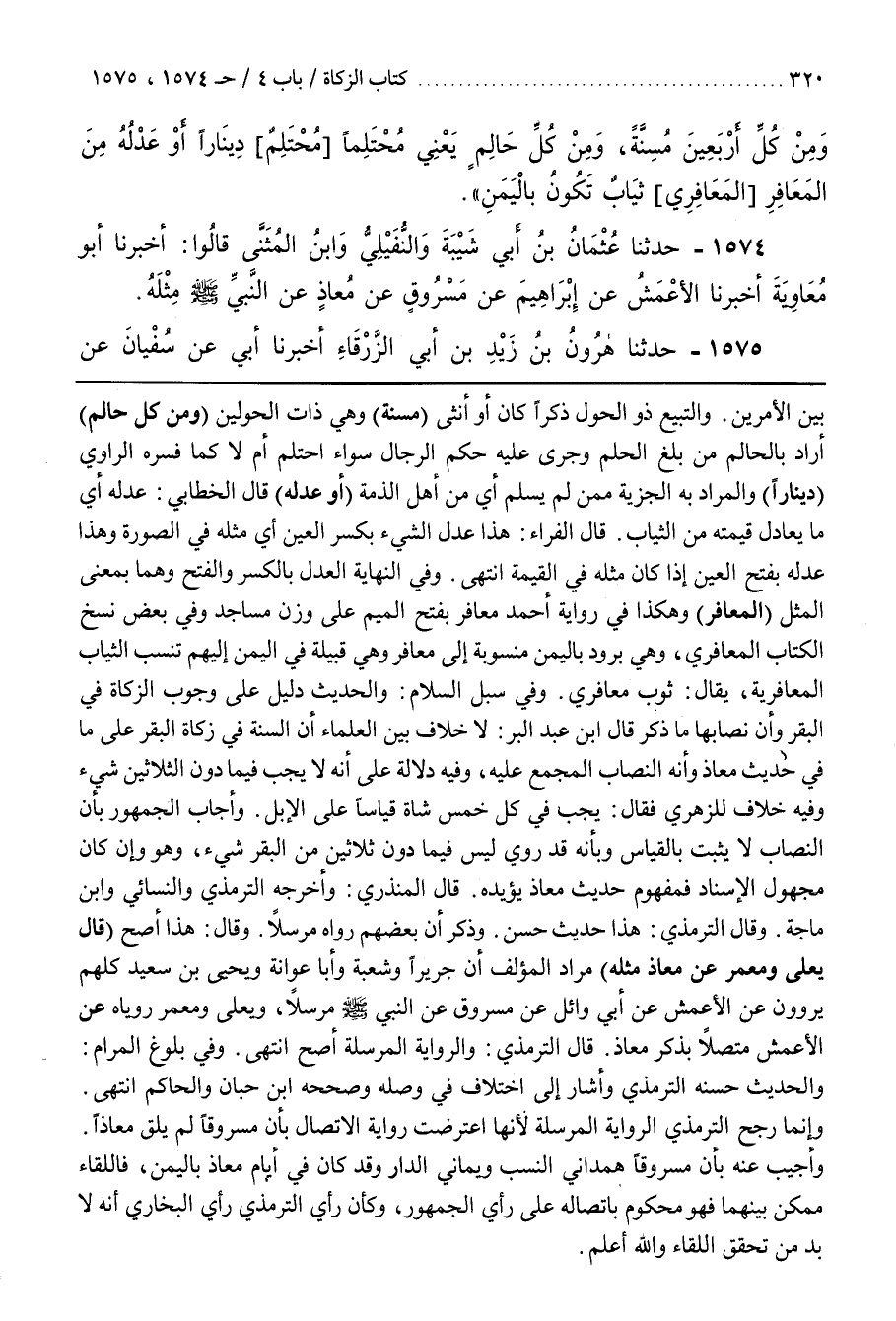 وَالتَّبِيعُ ذُو الْحَوْلِ ذَكَرًا كَانَ أَوْ أُنْثَى (مُسِنَّةٌ) وَهِيَ ذَاتُ الْحَوْلَيْنِ (وَمِنْ كُلِّ حَالِمٍ) أَرَادَ بِالْحَالِمِ مَنْ بَلَغَ الْحُلُمَ وَجَرَى عَلَيْهِ حُكْمُ الرِّجَالِ سَوَاءٌ احْتَلَمَ أَمْ لَا كَمَا فَسَّرَهُ الرَّاوِي (دِينَارًا) وَالْمُرَادُ بِهِ الْجِزْيَةُ مِمَّنْ لَمْ يُسْلِمْ أَيْ مِنْ أَهْلِ الذِّمَّةِ (أَوْ عَدْلُهُ) قَالَ الْخَطَّابِيُّ عَدْلُهُ أَيْ مَا يُعَادِلُ قِيمَتَهُ مِنَ الثِّيَابِ