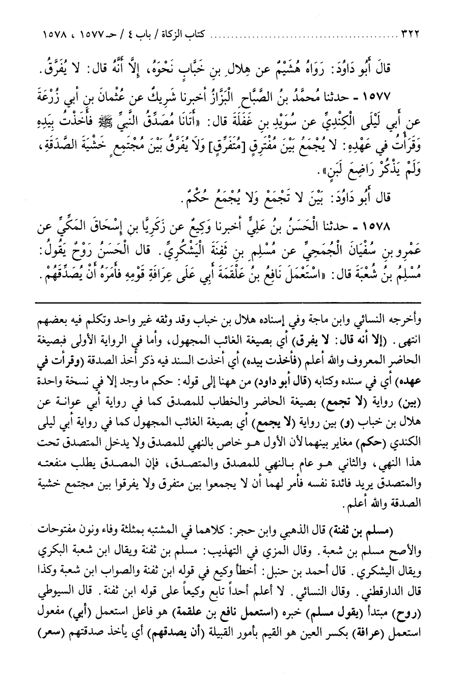 [1580] (فَأَخَذْتُ بِيَدِهِ) أَيْ أَخَذْتُ السَّنَدَ فِيهِ ذِكْرُ أَخْذِ الصَّدَقَةِ (وَقَرَأْتُ فِي عَهْدِهِ) أَنَّ فِي سَنَدِهِ وَكِتَابِهِ (قَالَ أبو داود) من ها هنا إِلَى قَوْلِهِ حُكْمُ مَا وَجَدَ إِلَّا فِي نُسْخَةٍ وَاحِدَةٍ (بَيْنَ) رِوَايَةِ (لَا تَجْمَعْ) بِصِيغَةِ الْحَاضِرِ وَالْخِطَابُ لِلْمُصَدِّقِ كَمَا فِي رِوَايَةِ أَبِي عوانة عن هلال بن خباب بَيْنَ رِوَايَةِ (لَا يُجْمَعُ) أَيْ بِصِيغَةِ الْغَائِبِ الْمَجْهُولِ كَمَا فِي رِوَايَةِ أَبِي لَيْلَى الْكِنْدِيِّ (حُكْمٌ) مُغَايِرٌ بَيْنَهُمَا لِأَنَّ الْأَوَّلَ هُوَ خَاصٌّ بِالنَّهْيِ لِلْمُصَدِّقِ وَلَا يَدْخُلُ الْمُتَصَدِّقُ تَحْتَ هَذَا النَّهْيِ وَالثَّانِي هُوَ عَامٌّ بِالنَّهْيِ لِلْمُصَدِّقِ وَالْمُتَصَدِّقِ فَإِنَّ الْمُصَدِّقَ يَطْلُبُ مَنْفَعَتَهُ وَالْمُتَصَدِّقَ يُرِيدُ فَائِدَةَ نَفْسِهِ فَأَمَرَ لَهُمَا أَنْ لَا يَجْمَعُوا بَيْنَ مُتَفَرِّقٍ وَلَا يُفَرِّقُوا بَيْنَ مُجْتَمِعٍ خَشْيَةَ الصَّدَقَةِ وَاللَّهُ أَعْلَمُ