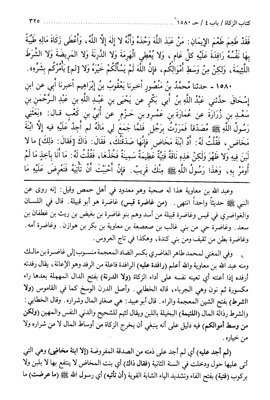 [1583] (لَمْ أَجِدْ عَلَيْهِ) أَيْ لَمْ أَجِدْ عَلَى ذِمَّتِهِ مِنَ الصَّدَقَةِ الْمَفْرُوضَةِ (إِلَّا ابْنَةَ مَخَاضٍ) وَهِيَ الَّتِي أَتَى عَلَيْهَا حَوْلٌ وَدَخَلَتْ فِي السَّنَةِ الثَّانِيَةِ (فَقَالَ ذَاكَ) أَيْ بِنْتُ الْمَخَاضِ لَا يُنْتَفَعُ بِهَا لَا بِلَبَنٍ وَلَا بِرُكُوبٍ (فَتِيَّةٌ) بِفَتْحِ الْفَاءِ وَتَشْدِيدِ الْيَاءِ الشَّابَّةُ الْقَوِيَّةُ (أَنْ تأتيه) أي رسول الله (مَا عَرَضْتُ) مَا