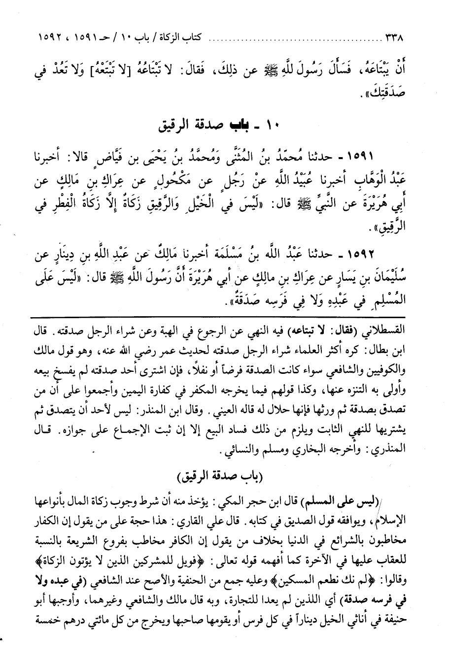 قال علي القارىء هَذَا حُجَّةٌ عَلَى مَنْ يَقُولُ إِنَّ الْكُفَّارَ مُخَاطَبُونَ بِالشَّرَائِعِ فِي الدُّنْيَا بِخِلَافِ مَنْ يَقُولُ إِنَّ الْكَافِرَ مُخَاطَبٌ بِفُرُوعِ الشَّرِيعَةِ بِالنِّسْبَةِ لِلْعِقَابِ عَلَيْهَا فِي الْآخِرَةِ كَمَا أَفْهَمَهُ قَوْلُهُ تَعَالَى فويل للمشركين الذين لا يؤتون الزكاة وقالوا لم نك نطعم المسكين وَعَلَيْهِ جَمْعٌ مِنَ الْحَنَفِيَّةِ وَالْأَصَحُّ عِنْدَ الشَّافِعِيِّ (فِي عَبْدِهِ وَلَا فِي فَرَسِهِ صَدَقَةٌ) أَيِ اللَّذَيْنِ لَمْ يُعَدَّا لِلتِّجَارَةِ وَبِهِ قَالَ مَالِكٌ وَالشَّافِعِيُّ وَغَيْرُهُمَا وَأَوْجَبَهَا أَبُو حَنِيفَةَ فِي أَنَاثِيِّ الْخَيْلِ دِينَارًا فِي كُلِّ فَرَسٍ أَوْ يُقَوِّمُهَا صَاحِبُهَا وَيُخْرِجُ مِنْ كُلِّ مِائَتَيْ دِرْهَمٍ خَمْسَةَ