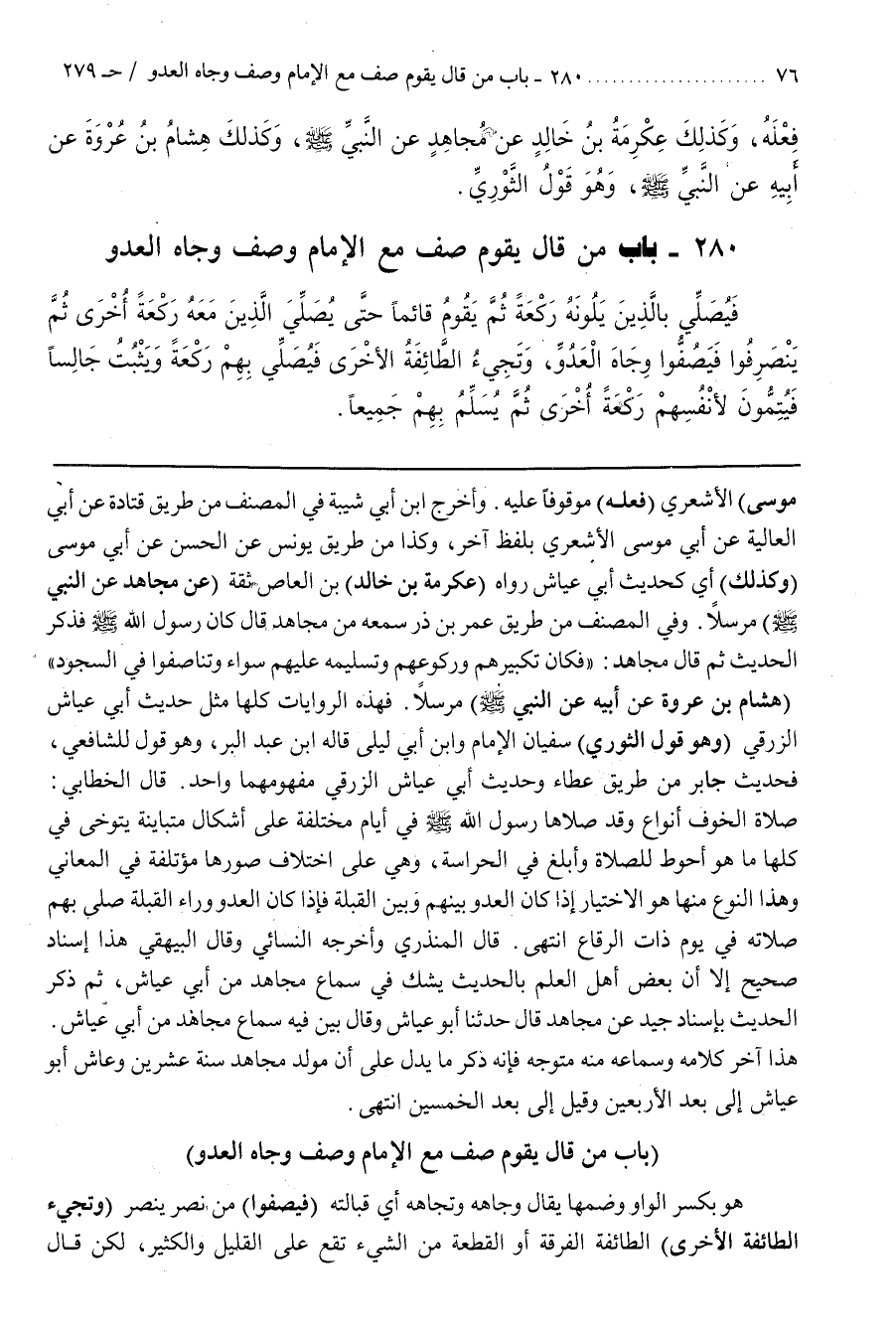 وِجَاهَ الْعَدُوِّ [1237] هُوَ بِكَسْرِ الْوَاوِ وَضَمِّهَا يُقَالُ وِجَاهُهُ وَتُجَاهُهُ أَيْ قُبَالَتُهُ (فَيَصِفُوا) مِنْ نَصَرَ يَنْصُرُ (وَتَجِيءُ الطَّائِفَةُ الْأُخْرَى) الطَّائِفَةُ الْفِرْقَةُ أَوِ الْقِطْعَةُ مِنَ الشَّيْءِ تَقَعُ عَلَى الْقَلِيلِ وَالْكَثِيرِ لَكِنْ قَالَ