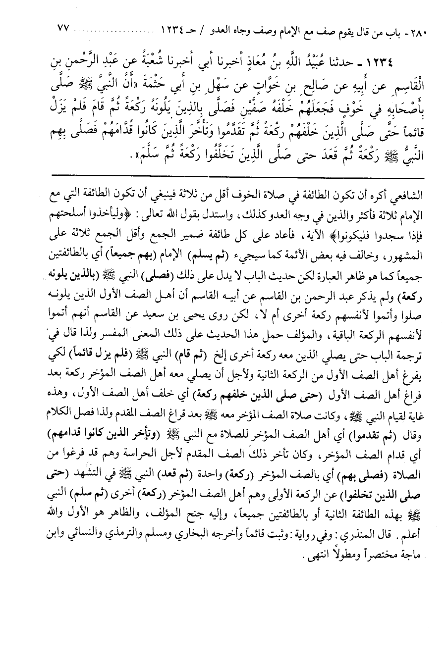(فَصَلَّى) النَّبِيُّ صَلَّى اللَّهُ عَلَيْهِ وَسَلَّمَ (بِالَّذِينَ يَلُونَهُ رَكْعَةً) وَلَمْ يَذْكُرْ عَبْدُ الرَّحْمَنِ بْنُ الْقَاسِمِ عَنْ أَبِيهِ الْقَاسِمِ أَنَّ أَهْلَ الصَّفِ الْأَوَّلِ الَّذِينَ يَلُونَهُ صَلَّوْا وَأَتَمُّوا لِأَنْفُسِهِمْ رَكْعَةً أُخْرَى أَمْ لَا لَكِنْ رَوَى يَحْيَى بْنُ سَعِيدٍ عَنِ الْقَاسِمِ أَنَّهُمْ أَتَمُّوا لِأَنْفُسِهِمُ الرَّكْعَةَ الْبَاقِيَةَ وَالْمُؤَلِّفُ حَمَلَ هَذَا الْحَدِيثَ عَلَى ذَلِكَ الْمَعْنَى الْمُفَسِّرِ وَلِذَا قَالَ فِي تَرْجَمَةِ الْبَابِ حَتَّى يُصَلِيَ الَّذِينَ مَعَهُ رَكْعَةً أُخْرَى إِلَخْ (ثُمَّ قَامَ) النَّبِيُّ صَلَّى اللَّهُ عَلَيْهِ وَسَلَّمَ (فَلَمْ يَزَلْ قَائِمًا) لِكَيْ يَفْرُغَ أهل الصف الأول من الركعة الثانية ولأجل أن يصلي معه أهل الصف المؤخر ركعة بعد فراغ أَهْلُ الصَّفِ الْأَوَّلِ (حَتَّى صَلَّى الَّذِينَ خَلْفَهُمْ رَكْعَةً) أَيْ خَلْفَ أَهْلِ الصَّفِ الْأَوَّلِ وَهَذِهِ غَايَةٌ لِقِيَامِ النَّبِيِّ صَلَّى اللَّهُ عَلَيْهِ وَسَلَّمَ وَكَانَتْ صَلَاةُ الصَّفِ الْمُؤَخَّرِ مَعَهُ صَلَّى اللَّهُ عَلَيْهِ وَسَلَّمَ بَعْدَ فَرَاغِ الصَّفِّ الْمُقَدَّمِ وَلِذَا فَصَلَ الْكَلَامَ وَقَالَ (ثُمَّ تَقَدَّمُوا) أَيْ أَهْلُ الصَّفِ الْمُؤَخَّرِ لِلصَّلَاةِ مَعَ النَّبِيِّ صَلَى اللَّهُ عَلَيْهِ وَسَلَّمَ (وَتَأَخَّرَ الَّذِينَ كَانُوا قُدَّامَهُمْ) أَيْ قُدَّامَ الصَّفِّ الْمُؤَخِّرِ وَكَانَ تَأَخَّرَ ذَلِكَ الصَّفُّ الْمُقَدَّمِ لِأَجْلِ الْحِرَاسَةِ وَهُمْ قَدْ فَرَغُوا مِنَ الصَّلَاةِ (فَصَلَّى بِهِمْ) أَيْ بِالصَّفِّ الْمُؤَخَّرِ (رَكْعَةً) وَاحِدَةً (ثُمَّ قَعَدَ) النَّبِيُّ صَلَّى اللَّهُ عَلَيْهِ وَسَلَّمَ فِي التَّشَهُّدِ (حَتَّى صَلَّى الَّذِينَ تَخَلَّفُوا) عَنِ الرَّكْعَةِ الْأُولِى وَهُمْ أَهْلُ الصَّفِّ الْمُؤَخَّرِ (رَكْعَةً) أُخْرَى (ثُمَّ سَلَّمَ) النَّبِيُّ صَلَّى اللَّهُ عَلَيْهِ وَسَلَّمَ بِهَذِهِ الطَّائِفَةِ الثَّانِيَةِ أَوْ بِالطَّائِفَتِينِ جَمِيعًا وَإِلَيْهِ جَنَحَ الْمُؤَلِّفُ وَالظَّاهِرُ هُوَ الْأَوَّلُ وَاللَّهُ أَعْلَمُ