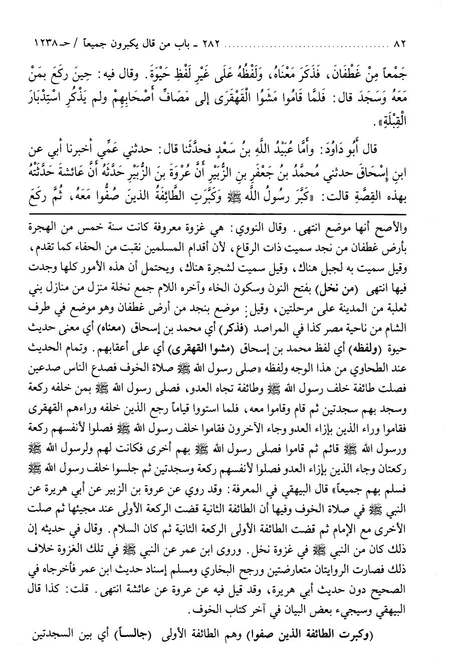 وَتَمَامُ الْحَدِيثِ عِنْدَ الطَّحَاوِيِّ مِنْ هَذَا الْوَجْهِ وَلَفْظُهُ صَلَّى رَسُولُ اللَّهِ صَلَّى اللَّهُ عَلَيْهِ وَسَلَّمَ صَلَاةَ الْخَوْفِ فَصَدَعَ النَّاسَ صَدْعَيْنِ فَصَلَّتْ طَائِفَةٌ خَلْفَ رَسُولِ اللَّهِ صَلَّى اللَّهُ عَلَيْهِ وَسَلَّمَ وَطَائِفَةٌ تُجَاهَ الْعَدُوِّ فَصَلَّى رَسُولُ اللَّهِ صَلَّى اللَّهُ عَلَيْهِ وَسَلَّمَ بِمَنْ خَلْفَهُ رَكْعَةً وَسَجَدَ بِهِمْ سَجْدَتَيْنِ ثُمَّ قَامَ وَقَامُوا مَعَهُ فَلَمَّا اسْتَوَوْا قِيَامًا رَجَعَ الَّذِينَ خَلْفَهُ وَرَاءَهُمُ الْقَهْقَرَى فَقَامُوا وَرَاءَ الَّذِينَ بِإِزَاءِ الْعَدُوِّ وَجَاءَ الْآخَرُونَ فَقَامُوا خَلْفَ رَسُولِ اللَّهِ صَلَّى اللَّهُ عَلَيْهِ وَسَلَّمَ فَصَلَّوْا لِأَنْفُسِهِمْ رَكْعَةً وَرَسُولُ اللَّهِ صَلَّى اللَّهُ عَلَيْهِ وَسَلَّمَ قَائِمٌ ثُمَّ قَامُوا فَصَلَّى رَسُولُ اللَّهِ صَلَّى اللَّهُ عَلَيْهِ وَسَلَّمَ بِهِمْ أُخْرَى فَكَانَتْ لَهُمْ وَلِرَسُولِ اللَّهِ صَلَّى اللَّهُ عَلَيْهِ وَسَلَّمَ رَكْعَتَانِ وَجَاءَ الَّذِينَ بِإِزَاءِ الْعَدُوِّ فَصَلَّوْا لِأَنْفُسِهِمْ رَكْعَةً وَسَجْدَتَيْنِ ثُمَّ جَلَسُوا خَلْفَ رَسُولِ اللَّهِ صَلَّى اللَّهُ عَلَيْهِ وَسَلَّمَ فَسَلَّمَ بِهِمْ جَمِيعًا قَالَ الْبَيْهَقِيُّ فِي الْمَعْرِفَةِ وَقَدْ رُوِيَ عَنِ عُرْوَةَ بْنِ الزُّبَيْرِ عَنْ أَبِي هُرَيْرَةَ عَنِ النَّبِيِّ صَلَّى اللَّهُ عليه وَسَلَّمَ فِي صَلَاةِ الْخَوْفِ وَفِيهَا أَنَّ الطَّائِفَةَ الثَّانِيَةَ قَضَتِ الرَّكْعَةَ الْأُولَى عِنْدَ مَجِيئِهَا ثُمَّ صَلَّتِ الْأُخْرَى مَعَ الْإِمَامِ ثُمَّ قَضَتِ الطَّائِفَةُ الْأُولَى الرَّكْعَةَ الثَّانِيَةَ ثُمَّ كَانَ السَّلَامُ