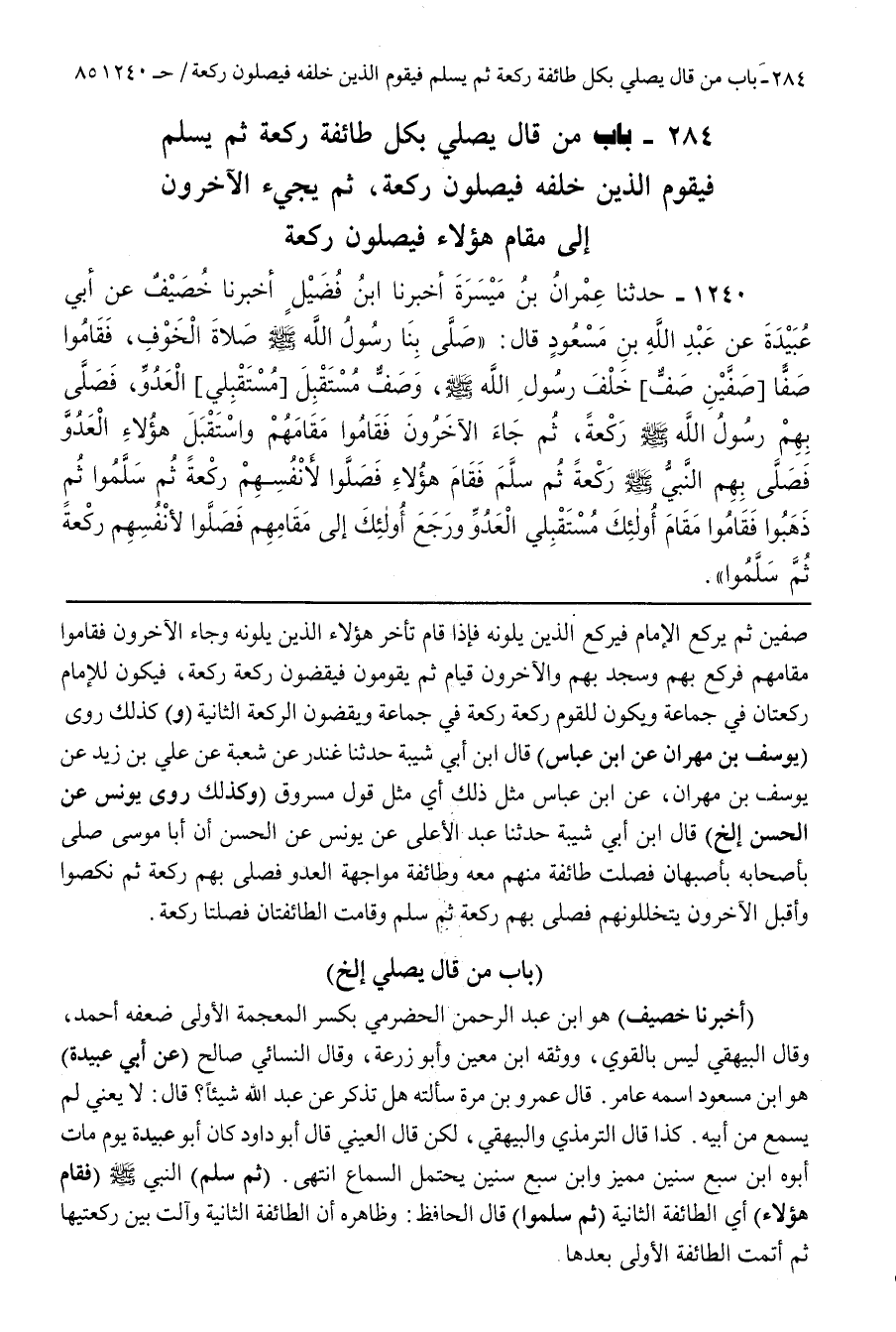 صَفَّيْنِ ثُمَّ يَرْكَعُ الْإِمَامُ فَيَرْكَعُ الَّذِينَ يَلُونَهُ ثُمَّ يَسْجُدُ بِالَّذِينَ يَلُونَهُ فَإِذَا قَامَ تَأَخَّرَ هَؤُلَاءِ الَّذِينَ يَلُونَهُ وَجَاءَ الْآخَرُونَ فَقَامُوا مَقَامَهُمْ فَرَكَعَ بِهِمْ وَسَجَدَ بِهِمْ وَالْآخَرُونَ قِيَامٌ ثُمَّ يَقُومُونَ فَيَقْضُونَ رَكْعَةً رَكْعَةً فَيَكُونُ لِلْإِمَامِ رَكْعَتَانِ في جماعة ويكون للقوم رَكْعَةً رَكْعَةً فِي جَمَاعَةٍ وَيَقْضُونَ الرَّكْعَةَ الثَّانِيَةَ كذلك روى (يوسف بن مهران عن بن عباس) قال بن أَبِي شَيْبَةَ حَدَّثَنَا غُنْدَرٌ عَنْ شُعْبَةَ عَنْ عَلِيِّ بْنِ زَيْدٍ عَنْ يُوسُفَ بْنِ مِهْرَانَ