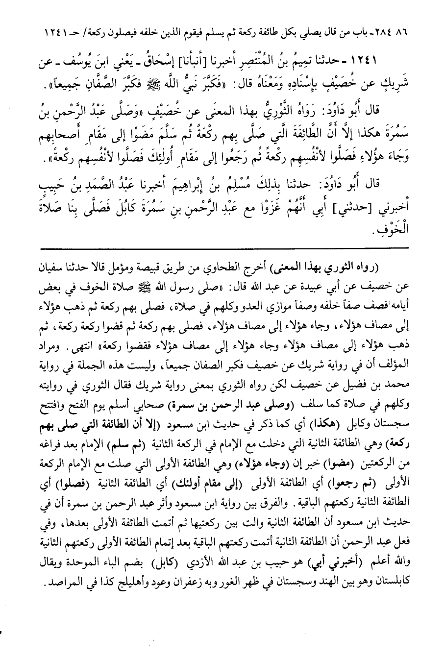 والفرق بين رواية بن مَسْعُودٍ وَأَثَرِ عَبْدِ الرَّحْمَنِ بْنِ سَمُرَةَ أَنَّ في حديث بن مَسْعُودٍ أَنَّ الطَّائِفَةَ الثَّانِيَةَ وَالَتْ بَيْنَ رَكْعَتَيْهَا ثُمَّ أَتَمَّتِ الطَّائِفَةُ الْأُولَى بَعْدَهَا وَفِي فِعْلِ عَبْدِ الرَّحْمَنِ أَنَّ الطَّائِفَةَ الثَّانِيَةَ أَتَمَّتْ رَكْعَتَهُمُ الْبَاقِيَةَ بَعْدَ إِتْمَامِ الطَّائِفَةِ الْأُولَى رَكْعَتَهُمُ الثَّانِيَةَ وَاللَّهُ أَعْلَمُ (أَخْبَرَنِي أَبِي) هُوَ حَبِيبُ بْنُ عَبْدِ اللَّهِ الْأَزْدِيُّ (كَابُلَ) بِضَمِّ الْبَاءِ الْمُوَحَّدَةِ وَيُقَالُ كَابُلِسْتَانُ وَهِيَ بَيْنَ الْهِنْدِ وَسِجِسْتَانَ فِي ظَهْرِ الْغَوْرِ وَبِهِ زَعْفَرَانٌ وَعُودٌ وَأَهْلِيلَجُ كَذَا في المراصد