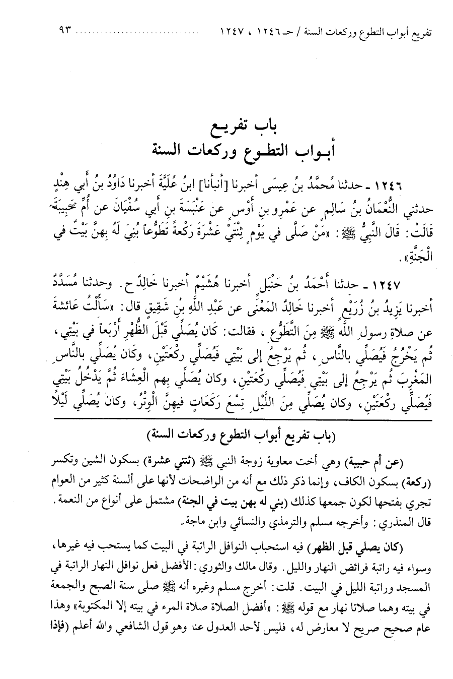 باب [1250] (عَنْ أُمِّ حَبِيبَةَ) وَهِيَ أُخْتُ مُعَاوِيَةَ زَوْجَةُ النَّبِيِّ صَلَّى اللَّهُ عَلَيْهِ وَسَلَّمَ (ثِنْتَيْ عَشْرَةَ) بِسُكُونِ الشِّينِ وَتُكْسَرُ (رَكْعَةً) بِسُكُونِ الْكَافِ وَإِنَّمَا ذَكَرَ ذَلِكَ مَعَ أَنَّهُ مِنَ الْوَاضِحَاتِ لِأَنَّهَا عَلَى أَلْسِنَةِ كَثِيرٍ مِنَ الْعَوَامِّ تَجْرِي بِفَتْحِهَا لِكَوْنِ جَمْعِهَا كَذَلِكَ (بُنِيَ لَهُ بِهِنَّ بَيْتٌ فِي الْجَنَّةِ) مُشْتَمِلٌ عَلَى أَنْوَاعٍ مِنَ النِّعْمَةِ