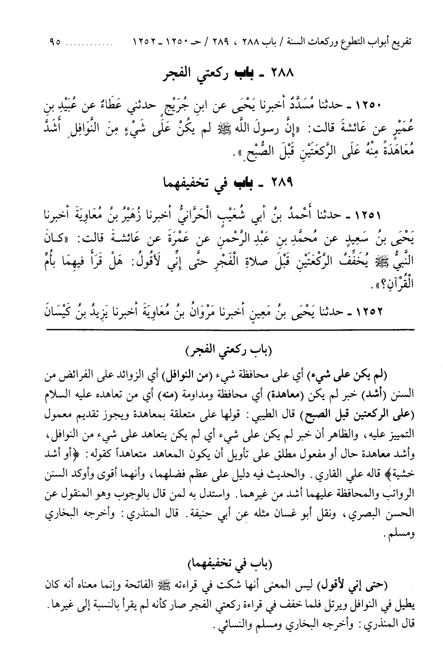 [1254] (لَمْ يَكُنْ عَلَى شَيْءٍ) أَيْ عَلَى مُحَافَظَةِ شَيْءٍ (مِنَ النَّوَافِلِ) أَيِ الزَّوَائِدِ عَلَى الْفَرَائِضِ مِنَ السُّنَنِ (أَشَدَّ) خَبَرُ لَمْ يَكُنْ (مُعَاهَدَةً) أَيْ مُحَافَظَةً وَمُدَاوَمَةً (مِنْهُ) أَيْ مِنْ تُعَاهُدِهِ عَلَى السَّلَامِ (عَلَى الرَّكْعَتَيْنِ قَبْلَ الصُّبْحِ) قَالَ الطِّيبِيُّ قَوْلُهَا عَلَى مُتَعَلِّقَةٌ بمعاهدة ويجوز تقديم معمول التمييز عَلَيْهِ وَالظَّاهِرُ أَنَّ خَبَرَ لَمْ يَكُنْ عَلَى شَيْءٍ أَيْ لَمْ يَكُنْ يَتَعَاهَدُ عَلَى شَيْءٍ مِنَ النَّوَافِلِ وَأَشَدُّ مُعَاهَدَةً حَالٌ أَوْ مَفْعُولٌ مُطْلَقٌ عَلَى تَأْوِيلِ أَنْ يَكُونَ الْمُعَاهَدُ مُتَعَاهِدًا كقوله أو أشد خشية قاله علي القارىء