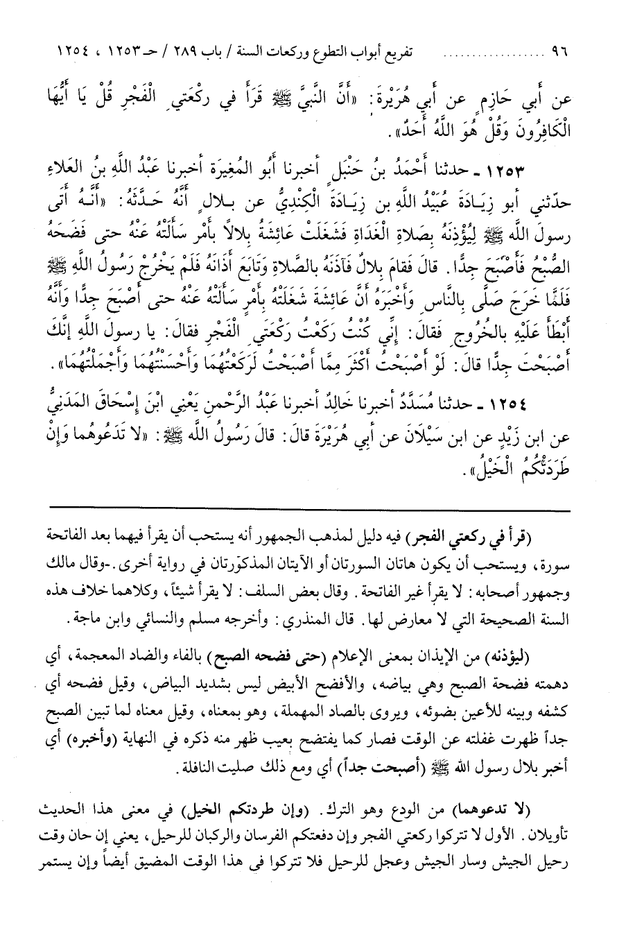 [1256] (قَرَأَ فِي رَكْعَتَيِ الْفَجْرِ) فِيهِ دَلِيلٌ لِمَذْهَبِ الْجُمْهُورِ أَنَّهُ يُسْتَحَبُّ أَنْ يُقْرَأَ فِيهِمَا بَعْدَ الْفَاتِحَةِ سُورَةٌ وَيُسْتَحَبُّ أَنْ يَكُونَ هَاتَانِ السُّورَتَانِ أَوِ الْآيَتَانِ الْمَذْكُورَتَانِ فِي رِوَايَةٍ أُخْرَى