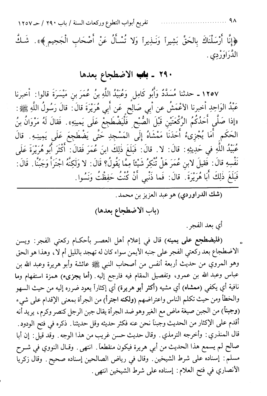 [1261] (فَلِيَضْطَجِعْ عَلَى يَمِينِهِ) قَالَ فِي إِعْلَامِ أَهْلِ الْبَصْرَةِ بِأَحْكَامِ رَكْعَتَيِ الْفَجْرِ وَيُسَنُّ الِاضْطِجَاعُ بَعْدَ رَكْعَتَيِ الْفَجْرِ عَلَى جَنْبِهِ الْأَيْمَنِ سَوَاءٌ كَانَ لَهُ تَهَجُّدٌ بِاللَّيْلِ أَمْ لَا وَهَذَا هُوَ الْحَقُّ وَهُوَ الْمَرْوِيُّ مِنْ حَدِيثِ أَرْبَعَةِ أَنْفُسٍ مِنْ أَصْحَابِ النَّبِيِّ صَلَّى اللَّهُ عَلَيْهِ وَسَلَّمَ عَائِشَةُ وَأَبُو هُرَيْرَةَ وَعَبْدُ اللَّهِ بْنُ عَبَّاسٍ وَعَبْدُ اللَّهِ بْنُ عَمْرٍو وَتَفْصِيلُ الْمُقَامِ فِيهِ فَارْجِعْ إِلَيْهِ (أَمَا يُجْزِئُ) هَمْزَةُ اسْتِفْهَامٍ وَمَا نَافِيَةٌ أَيْ يَكْفِي (مَمْشَاهُ) أَيْ مَشْيُهُ (أَكْثَرَ أَبُو هُرَيْرَةَ) أَيْ إِكْثَارًا يَعُودُ ضَرَرُهُ إِلَيْهِ مِنْ حَيْثُ السَّهْوِ وَالْخَطَأِ وَمِنْ حَيْثُ تَكَلُّمِ النَّاسِ وَاعْتِرَاضِهِمْ (وَلَكِنَّهُ اجْتَرَأَ) مِنَ الْجُرْأَةِ بِمَعْنَى الْإِقْدَامِ عَلَى شَيْءٍ (وَجَبُنَّا) مِنَ الْجُبْنِ صِيغَةُ مَاضٍ مَعَ الْغَيْرِ وَهُوَ ضِدُّ الْجُرْأَةِ يُقَالُ جَبَنَ الرَّجُلُ كَنَصَرَ وَكَرُمَ يُرِيدُ أَنَّهُ أَقْدَمَ عَلَى الْإِكْثَارِ مِنَ الْحَدِيثِ وَجَبُنَّا نَحْنُ عَنْهُ فَكَثُرَ حَدِيثُهُ وَقَلَّ حَدِيثُنَا