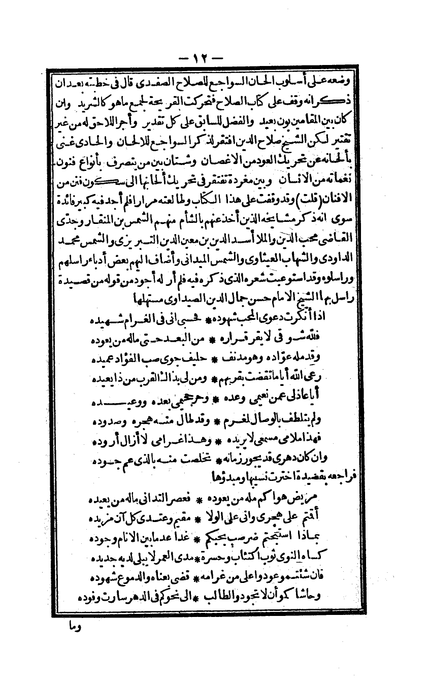 وَضعه على أسلوب الحان السواجع للصلاح الصفدى قَالَ فى خطبَته بعد أَن ذكر انه وقف على كتاب الصّلاح فتحركت القريحة لجمع مَا هُوَ كالشريد وان كَانَ بَين المقامين بون بعيد وَالْفضل للسابق على كل تَقْدِير وَأجر اللَّاحِق لَهُ من غير تقتير لَكِن الشَّيْخ صَلَاح الدّين افْتقر لذكر السواجع للالحان والحادى غنى بألحانه عَن تَحْرِيك الْعود من الاغصان وشتان بَين من يتَصَرَّف بأنواع فنون نغماته من الانسان وَبَين مغردة تفْتَقر فى تَحْرِيك ألحانها الى سُكُون فنن من الافنان قلت وَقد وقفت على هَذَا الْكتاب وطالعته مرَارًا فَلم أجد فِيهِ كَبِير فَائِدَة سوى انه ذكر مشايخه الَّذين أَخذ عَنْهُم بالشأم مِنْهُم الشَّمْس بن المنقار وجدى القاضى محب الدّين والملا أَسد الدّين بن معِين الدّين التبر يزى وَالشَّمْس مُحَمَّد الداودى والشهاب العيثاوى وَالشَّمْس الميدانى وأضاف اليهم بعض أدباء راسلهم وراسلوه وَقد استوعبت شعره الذى ذكره فِيهِ فَلم أر لَهُ أَجود من قَوْله من قصيدة راسل بهَا الشَّيْخ الامام حسن جمال الدّين الصيداوى مستهلها