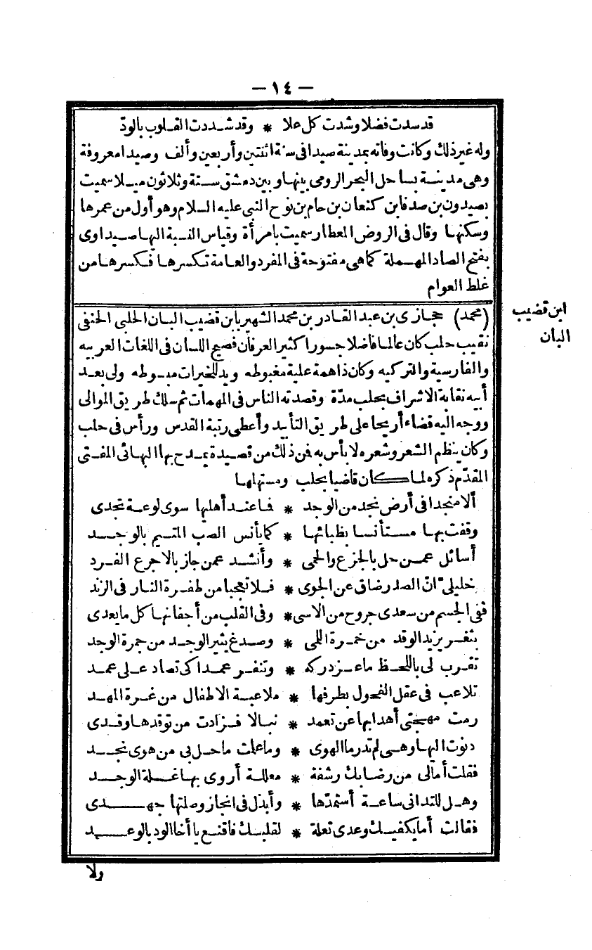مُحَمَّد حجازى بن عبد الْقَادِر بن مُحَمَّد الشهير بِابْن قضيب البان الحلبى الحنفى نقيب حلب كَانَ عَالما فَاضلا جسورا كثير الْعرْفَان فصيح اللِّسَان فى اللُّغَات الْعَرَبيَّة والفارسية والتركيه وَكَانَ ذَا همة عالية مغبوطه وَيَد لِلْخَيْرَاتِ مبسوطه ولى بعد أَبِيه نقابة الاشراف بحلب مُدَّة وقصدته النَّاس فى الْمُهِمَّات ثمَّ سلك طَرِيق الموالى وَوجه اليه قَضَاء أرِيحَا على طَرِيق التَّأْبِيد وَأعْطى رُتْبَة الْقُدس وَرَأس فى حلب وَكَانَ ينظم الشّعْر وشعره لَا بَأْس بِهِ فَمن ذَلِك من قصيدة يمدح بهَا البهائى الْمُفْتى الْمُقدم ذكره لما كَانَ قَاضِيا بحلب ومستهلها