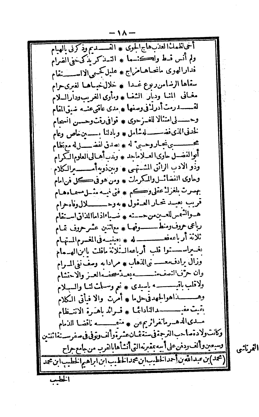 وَكَانَت ولادَة صَاحب التَّرْجَمَة فى سنة ثَمَان عشرَة وَألف وَتوفى فى صفر سنة اثْنَتَيْنِ وَسبعين وَألف وَدفن على أَبِيه بمقبرته الَّتِى أَنْشَأَهَا بِالْقربِ من جَامع جراح