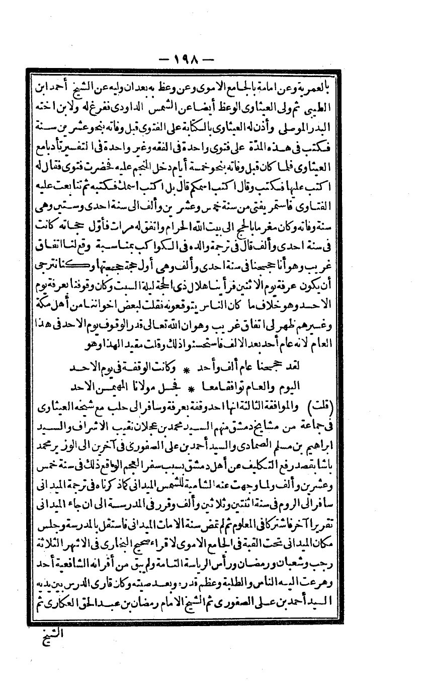 قلت والموافقة الثَّالِثَة انها اُحْدُ وَقْفَة بِعَرَفَة وسافر الى حلب مَعَ شَيْخه العيثاوى فى جمَاعَة من مَشَايِخ دمشق مِنْهُم السَّيِّد مُحَمَّد بن عجلَان نقيب الاشراف وَالسَّيِّد ابراهيم بن مُسلم الصمادى وَالسَّيِّد أَحْمد بن على الصفورى فى آخَرين الى الْوَزير مُحَمَّد باشا بِقصد رفع التَّكْلِيف عَن أهل دمشق بِسَبَب السّفر الْعَجم الْوَاقِع ذَلِك فى سنة خمس وَعشْرين وَألف وَلما وجهت عَنهُ الشامية للشمس الميدانى كَمَا ذَكرْنَاهُ فى تَرْجَمَة الميدانى سَافر الى الرّوم فى سنة اثْنَتَيْنِ وَثَلَاثِينَ وَألف وَقرر فى الْمدرسَة الى ان جَاءَ الميدانى تقريرا آخر فاشتركا فى الْمَعْلُوم ثمَّ لم تمض سنة الا مَاتَ الميدانى فاستقل بِالْمَدْرَسَةِ وَجلسَ مَكَان الميدانى تَحت الْقبَّة فى الْجَامِع الاموى لاقراء صَحِيح البخارى فى الاشهر الثَّلَاثَة رَجَب وَشَعْبَان ورمضان وَرَأس الرياسة التَّامَّة وَلم يبْق من أقرانه الشَّافِعِيَّة أحد وهرعت اليه النَّاس والطلبة وَعظم قدره وَبعد صيته وَكَانَ قارى الدَّرْس بَين يَدَيْهِ السَّيِّد أَحْمد بن على الصفورى ثمَّ الشَّيْخ الامام رَمَضَان بن عبد الْحق العكارى ثمَّ