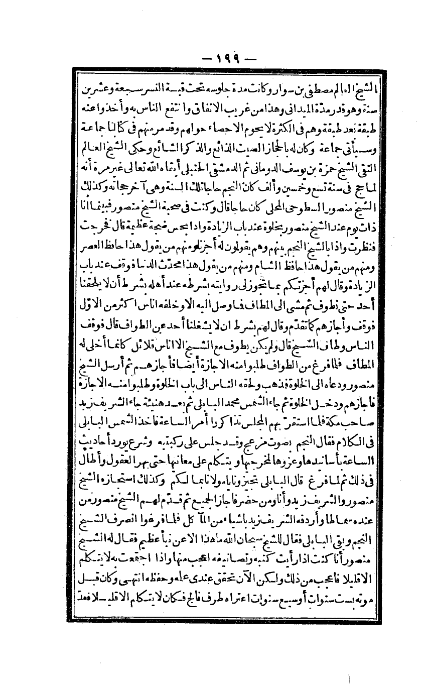 الشَّيْخ الْعَالم مصطفى بن سوار وَكَانَت مُدَّة جُلُوسه تَحت قبَّة النسْر سَبْعَة وَعشْرين سنة وَهُوَ قَادر مُدَّة الميدانى وَهَذَا من غَرِيب الِاتِّفَاق وانتفع النَّاس بِهِ وَأخذُوا عَنهُ طبقَة بعد طبقَة وهم فى الْكَثْرَة لَا يحوم الا حِصَار حَولهمْ وَقد مر مِنْهُم فى كتَابنَا جمَاعَة وسيأتى جمَاعَة وَكَانَ لَهُ بالحجاز الصيت الذائع وَالذكر الشَّائِع وَحكى الشَّيْخ الْعَالم التقى الشَّيْخ حَمْزَة بن يُوسُف الدومانى ثمَّ الدمشقى الحنبلى أبقاه الله تَعَالَى غير مرّة أَنه لما حج فى سنة تسع وَخمسين وَألف كَانَ النَّجْم حَاجا تِلْكَ السّنة وهى آخر حجاته وَكَذَلِكَ الشَّيْخ مَنْصُور السطوحى الْمحلى كَانَ حَاجا قَالَ وَكنت صُحْبَة الشَّيْخ مَنْصُور فَبَيْنَمَا أَنا ذَات يَوْم عِنْد الشَّيْخ مَنْصُور بخلوة عِنْد بَاب الزِّيَادَة واذا بحس ضجة عَظِيمَة قَالَ فَخرجت فَنَظَرت واذا بالشيخ النَّجْم بَينهم وهم يَقُولُونَ لَهُ أجزنا وَمِنْهُم من يَقُول هَذَا حَافظ الْعَصْر وَمِنْهُم من يَقُول هَذَا حَافظ الشَّام وَمِنْهُم من يَقُول هَذَا مُحدث الدُّنْيَا فَوقف عِنْد بَاب الزِّيَادَة وَقَالَ لَهُم أجزتكم بِمَا تجوز لى رِوَايَته بِشَرْطِهِ عِنْد أَهله بِشَرْط أَن لَا يلحقنا أحد حَتَّى نطوف ثمَّ مَشى الى المطاف فَمَا وصل اليه الا وَخَلفه اناس اكثر من الاولى فَوقف وَأَجَازَهُمْ كَمَا تقدم وَقَالَ لَهُم بِشَرْط ان لَا يشغلنا أحد عَن الطّواف قَالَ فَوقف النَّاس وَطَاف الشَّيْخ قَالَ وَلم يكن يطوف مَعَ الشَّيْخ الا اناس قَلَائِل كانما أخلى لَهُ المطاف فَلَمَّا فرغ من الطّواف طلبُوا مِنْهُ الاجازة أَيْضا فأجازهم ثمَّ أرسل الشَّيْخ مَنْصُور وَدعَاهُ الى الْخلْوَة فَذهب ولحقه النَّاس الى بَاب الْخلْوَة وطلبوا مِنْهُ الاجازة فاجازهم وَدخل الْخلْوَة ثمَّ جَاءَ الشَّمْس مُحَمَّد البابلى ثمَّ بعد هنيئة جَاءَ الشريف زبد صَاحب مَكَّة فَلَمَّا اسْتَقر بهم الْمجْلس تَذَاكَرُوا أَمر السَّاعَة فاخذ الشَّمْس البابلى فى الْكَلَام فَقَالَ النَّجْم بِصَوْت مزعج وَقد جلس على ركبته وَشرع يُورد أَحَادِيث السَّاعَة بأسانيد وعزوها لمخرجيها وَيتَكَلَّم على مَعَانِيهَا حَتَّى بهر الْعُقُول وَأطَال فى ذَلِك ثمَّ لما فرغ قَالَ البابلى تجيزونا يَا مَوْلَانَا بِمَا لكم وَكَذَلِكَ استجازه الشَّيْخ مَنْصُور والشريف زيد وَأَنا وَمن حضر فاجاز الْجَمِيع ثمَّ قدم لَهُم الشَّيْخ مَنْصُور من عِنْده سماطا وأردفه الشريف زيد باشياء من المآكل فَلَمَّا فرغوا انْصَرف الشَّيْخ النَّجْم وبقى البابلى فَقَالَ للشَّيْخ سُبْحَانَ الله مَا هَذَا الا عَن نبأ عَظِيم فَقَالَ لَهُ الشَّيْخ مَنْصُور أَنا كنت اذا رَأَيْت كتبه وتصانيفيه اعْجَبْ مِنْهَا واذا اجْتمعت بِهِ لَا يتَكَلَّم الا قَلِيلا فاعجب من ذَلِك وَلَكِن الْآن تحقق عندى علمه وَحفظه انْتهى وَكَانَ قبل مَوته بست سنوات أَو سبع سنوات اعتراه طرف فالج فَكَانَ لَا يتَكَلَّم الا قَلِيلا فعد