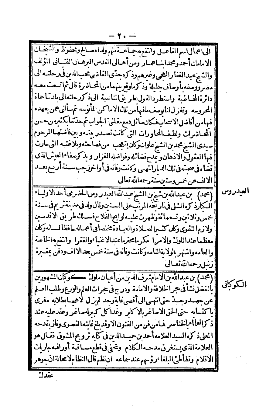 مُحَمَّد بن عبد الله بن شيخ بن الشَّيْخ عبد الله العيدرورس الحضرمى أحد الاولياء الْكِبَار ذكره الشلى فى تَارِيخه الْمُرَتّب على السنين وَقَالَ ولد فى مَدِينَة تريم فى سنة خمس وَثَلَاثِينَ وَتِسْعمِائَة وَظَهَرت عَلَيْهِ لوايح الْفَلاح فسلك طَرِيق الاقدمين ولازم التَّقْوَى وَكَانَ كثير الصَّلَاة وَالْعِبَادَة مخلصا فى أَعماله حَافِظًا لِسَانه وَكَانَ مُعظما عِنْد الْمُلُوك والامرا مكرما مُحْتَرما عِنْد الاغنياء والفقرا وانتفع بِهِ الْخَاصَّة والعامه واشتهر بِالْولَايَةِ التَّامَّة وَكَانَت وَفَاته فى سنة خمس بعد الالف وَدفن بمقبرة زنبل رَحمَه الله تَعَالَى