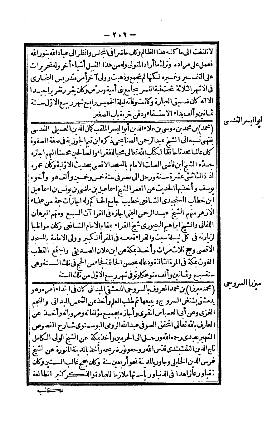 مُحَمَّد ميرزا بن مُحَمَّد الْمَعْرُوف بالسروجى الدمشقى الميدانى كَانَ فى ابْتِدَاء أمره وَهُوَ بِدِمَشْق يشْتَغل السُّرُوج ويبيعها ثمَّ طلب الْعلم وَأخذ عَن الشيم الميدانى والنجم الغزى وَعَن أَبى الْعَبَّاس المقرى وَأَجَازَهُ بِجَمِيعِ مؤلفاته ومروياته وَأخذ عَن الْعَارِف بِاللَّه تَعَالَى الْمُحَقق الصوفى عبد الله الرومى البوسنوى شَارِح الفصوص الشهير بعبدى رَحمَه الله ورحل الى الْحَرَمَيْنِ وَأخذ بِمَكَّة عَن الشَّيْخ الولى الْكَامِل تَاج الدّين النقشبندى قدس الله روحه وَنور ضريحه وَأخذ بِالْمَدِينَةِ المنورة عَن الشَّيْخ غرس الدّين الخليلى وجاور بِالْمَدِينَةِ نَحْو أَرْبَعِينَ سنة وَكَانَ يحجّ غَالب السنين وَكَانَ تقيا ورعا زاهدا فى الدُّنْيَا ورياستها ملازما لِلْعِبَادَةِ وَالذكر كثير المطالعة