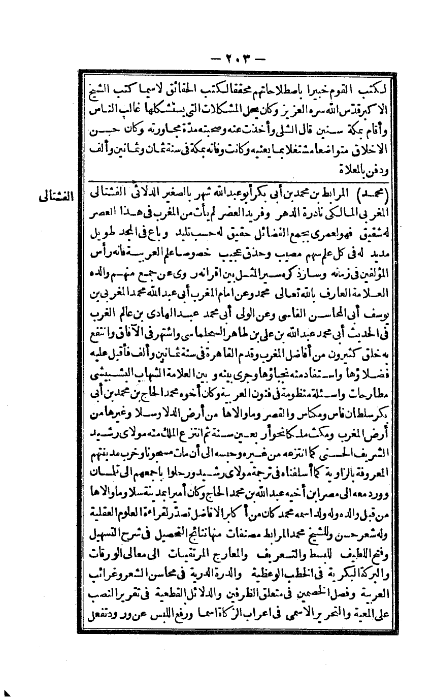 مُحَمَّد المرابط بن مُحَمَّد بن أَبى بكر أَبُو عبد الله شهر بالصغير الدلائى الفشتالى المغربى المالكى نادرة الدَّهْر وفريد العضر لم يَأْتِ من الْمغرب فى هَذَا الْعَصْر لَهُ شَقِيق فَهُوَ لعمرى بِجمع الْفَضَائِل حقيق لَهُ حسب تليد وَبَاعَ فى الْمجد طَوِيل مديد لَهُ فى كل علم سهم مُصِيب وحذق عَجِيب خُصُوصا علم الْعَرَبيَّة فانه رَأس المؤلفين فى زَمَانه وَسَار ذكره مسير الْمثل بَين اقرانه روى عَن جمع مِنْهُم وَالِده الْعَلامَة الْعَارِف بِاللَّه تَعَالَى مُحَمَّد وَعَن امام الْمغرب أَبى عبد الله مُحَمَّد المغربى بن يُوسُف أَبى المحاسن الفاسى وَعَن الولى أَبى مُحَمَّد عبد الهادى بن عَالم الغرب فى الحَدِيث أَبى مُحَمَّد عبد الله بن على بن طَاهِر السجلماسى واشتهر فى الْآفَاق وانتفع بِهِ خلق كَثِيرُونَ من أفاضل الْمغرب وَقدم الْقَاهِرَة فى سنة ثَمَانِينَ وَألف فَأقبل عَلَيْهِ فضلاؤها واستفاد مِنْهُ نجباؤها وَجرى بنيه وَبَين الْعَلامَة الشهَاب البشبيشى مطارحات واسئلة منظومة فى فنون الْعَرَبيَّة وَكَانَ أَخُوهُ مُحَمَّد الْحَاج بن مُحَمَّد بن أَبى بكر سُلْطَان فاس ومكناس وَالْقصر وَمَا والاها من أَرض الدلا وسلا وَغَيرهَا من أَرض الْمغرب وَمكث ملكا نَحْو أَرْبَعِينَ سنة ثمَّ انتزع الْملك مِنْهُ مولاى رشيد الشريف الْحسنى كَمَا انتزعه من غَيره وحبسه الى أَن مَاتَ مسجونا وَخرب مدينتهم الْمَعْرُوفَة بالزاوية كَمَا أسلفناه فى تَرْجَمَة مولاى رشيد ورحلوا باجمعهم الى تلمسان وَورد مَعَه الى مصر ابْن أَخِيه عبد الله بن مُحَمَّد الْحَاج وَكَانَ أَمِيرا بِمَدِينَة سلا وَمَا والاها من قبل وَالِده وَله ولد اسْمه مُحَمَّد كَانَ من أكَابِر الافاضل تصدر لقِرَاءَة الْعُلُوم الْعَقْلِيَّة وَله // شعر حسن // وللسيخ مُحَمَّد المرابط مصنفات مِنْهَا نتائج التَّحْصِيل فى شرح التسهيل وَفتح اللَّطِيف للبسط والتعريف والمعارج المرتقيات الى معالى الورقات وَالْبركَة البكرية فى الْخطب الوعظية والدرة الدرية فى محَاسِن الشّعْر وغرائب الْعَرَبيَّة وَفصل الْخَصْمَيْنِ فى مُتَعَلق الظرفين والدلائل القطعية فى تَقْرِير النصب على الْمَعِيَّة والتحرير الاسمى فى اعراب الزَّكَاة اسْما وَرفع اللّبْس عَن وُرُود تفعل
