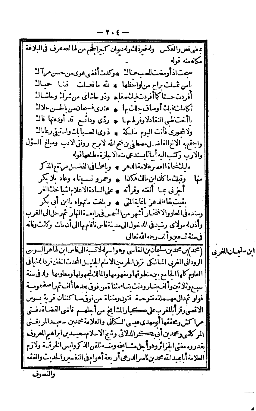 وَسَنَده فى الْعُلُوّ والافتخار أشهر من الشَّمْس فى رَابِعَة النَّهَار ثمَّ رَحل الى الْمغرب وَأذن لَهُ مولاى رشيد فى الدُّخُول الى مَدِينَة فاس فَأَقَامَ بهَا الى أَن مَاتَ وَكَانَت وَفَاته فى سنة تسعين وَألف رَحمَه الله تَعَالَى