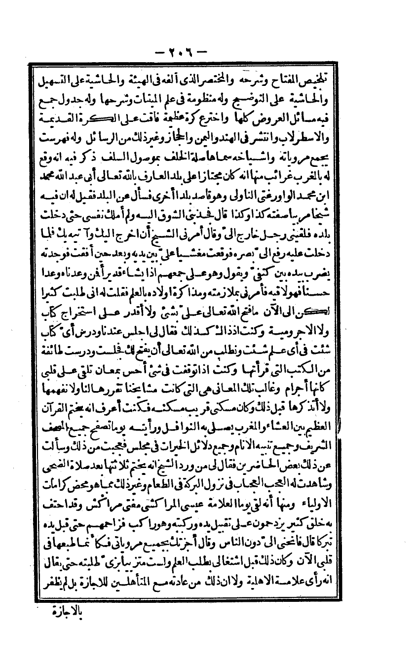 تَلْخِيص الْمِفْتَاح وَشَرحه والمختص الذى آلفه فى الْهَيْئَة والحاشية على التسهيل والحاشية على التَّوْضِيح وَله منظومة فى علم الْمِيقَات وَشَرحهَا وَله جدول جمع فِيهِ مسَائِل الْعرُوض كلهَا واخترع كرة عَظِيمَة فاقت على الكرة الْقَدِيمَة والاسطرلاب وانتشر فى الْهِنْد واليمن والحجاز وَغير ذَلِك من الرسائل وَله فهرست يجمع مرويانه واشياخه سَمَّاهَا صلَة الْخلف بموصول السّلف ذكر فِيهِ انه وَقع لَهُ بالمغرب غرائب مِنْهَا انه كَانَ مجتازا على بلد الْعَارِف بِاللَّه تَعَالَى أَبى عبد الله مُحَمَّد ابْن مُحَمَّد الواورغتى الناولى وَهُوَ قَاصد بلد أُخْرَى فَسَأَلَ عَن الْبَلَد فَقيل لَهُ ان فِيهِ شَيخا مربيا صفته كَذَا وَكَذَا قَالَ فجذبنى الشوق اليه وَلم أملك نفسى حَتَّى دخلت بَلَده فلقينى رجل خَارج الى وَقَالَ أمرنى الشَّيْخ أَن اخْرُج اليك وآتيه بك فَلَمَّا دخلت عَلَيْهِ رفع الى بَصَره فَوَقَعت مغشيا على بَين يَدَيْهِ وَبعد حِين أَفَقْت فَوَجَدته يضْرب بِيَدِهِ بَين كتفى وَيَقُول وَهُوَ على جمعهم اذا يَشَاء قدير أَفَمَن وعدنا وَعدا حسنا فَهُوَ لاقيه فأمرنى بملازمته ومذاكرة أَوْلَاده بِالْعلمِ فَقلت لَهُ انى طلبت كثيرا لَكِن الى الْآن مَا فتح الله تَعَالَى على بشئ وَلَا أقدر على اسْتِخْرَاج كتاب وَلَا الاجررومية وَكنت اذ ذَاك كَذَلِك فَقَالَ لى اجْلِسْ عندنَا ودرست أى كتاب شِئْت فى أى علم شِئْت ونطلب من الله وَتَعَالَى أَن يفتح لَك فَجَلَست ودرس طَائِفَة من الْكتب الَّتِى قرأتها وَكنت اذا توقفت فى شئ أحس بمعان تلقى على قلبى كانها أجرام وغالب تِلْكَ الْمعَانى هى الَّتِى كَانَت مَشَايِخنَا تقررها لنا وَلَا نفهمها وَلَا أتذكرها قبل ذَلِك وَكَانَ مسكنى قريب مَسْكَنه فَكنت أعرف انه يخْتم الْقُرْآن الْعَظِيم بَين الْعشَاء وَالْمغْرب يصلى بِهِ النَّوَافِل ورأيته يَوْمًا تصفح جَمِيع الْمُصحف الشريف وَجَمِيع تَنْبِيه الانام وَجَمِيع دَلَائِل الْخيرَات فى مجْلِس فعجبت من ذَلِك وَسَأَلت عَن ذَلِك بعض الْحَاضِرين فَقَالَ لى من ورد الشَّيْخ انه يخْتم ثلاثتها بعد صَلَاة الضُّحَى وشاهدت لَهُ الْعجب العجاب فى نزُول الْبركَة فى الطَّعَام وَغير ذَلِك بِمَا هُوَ مَحْض كرامات الاولياء وَمِنْهَا أَنه لقى يَوْمًا الْعَلامَة عِيسَى المراكشى مفتى مراكش وَقد احتف بِهِ خلق كثير يزدحمون على تَقْبِيل يَده وركبته وَهُوَ رَاكب فزاحمهم حَتَّى قبل يَده تبركا قَالَ فَانْحنى الى دون النَّاس وَقَالَ أجزتك بِجَمِيعِ مروياتى فَكَأَنَّمَا طبعها فى قلبى الْآن وَكَانَ ذَلِك قبل اشتغالى بِطَلَب الْعلم وَلست متزييا بزى طلبته حَتَّى يُقَال انه رأى عَلامَة الاهلية وَلَا ان ذَلِك من عَادَته مَعَ المتأهلين للاجازة بل لم يظفر