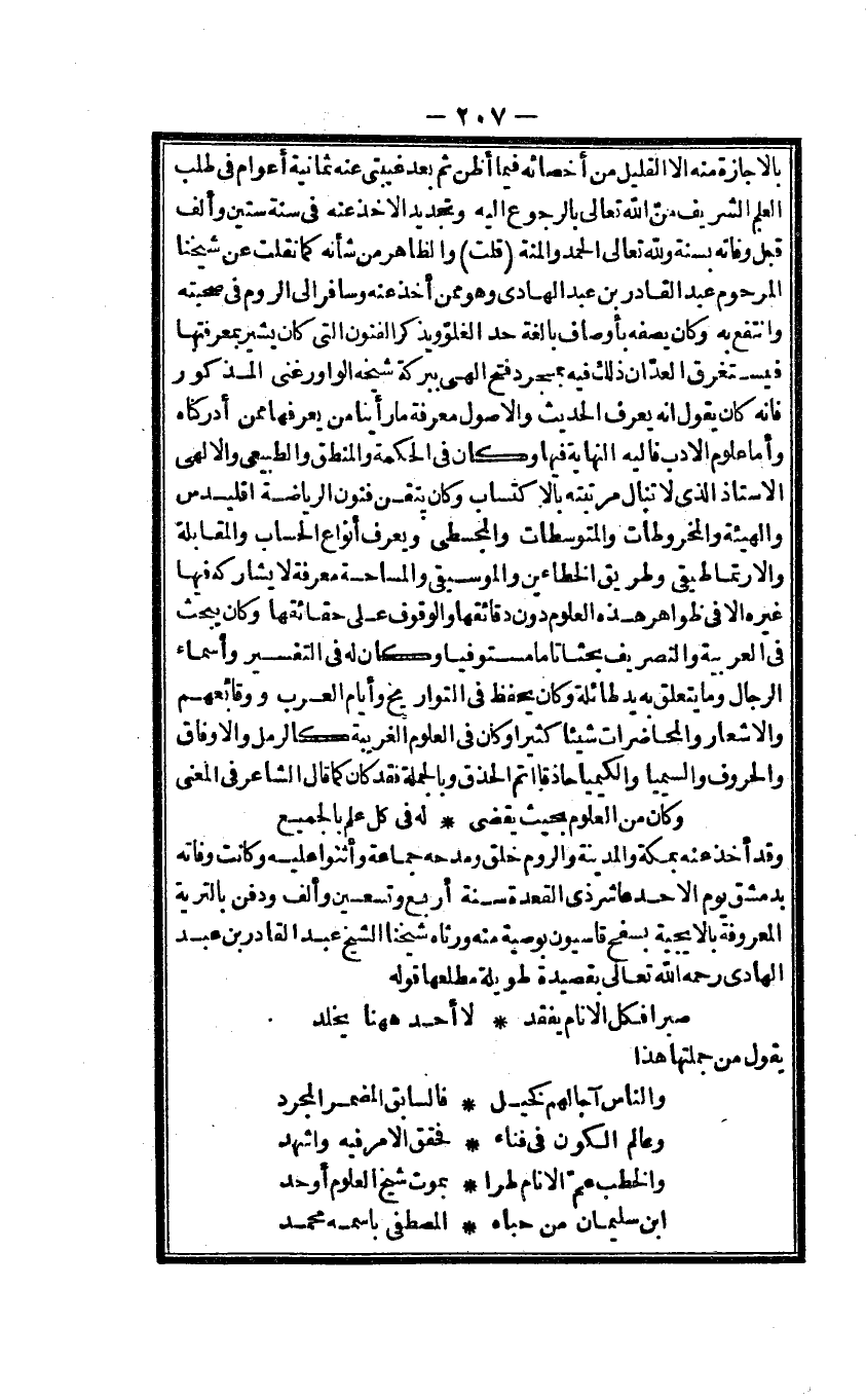 بالاجازة مِنْهُ الا الْقَلِيل من أخصائه فَمَا أَظن ثمَّ بعد غيبتى عَنهُ ثَمَانِيَة أَعْوَام فى طلب الْعلم الشريف من الله تَعَالَى بِالرُّجُوعِ اليه وتجديد الاخذ عَنهُ فى سنة سِتِّينَ وَألف قبل وَفَاته بِسنة وَللَّه تَعَالَى الْحَمد والْمنَّة قلت والظاهرين من شَأْنه كَمَا نقلت عَن شَيخنَا المرحوم عبد الْقَادِر بن عبد الهادى وَهُوَ مِمَّن أَخذ عَنهُ وسافر الى الرّوم فى صحبته وانتفع بِهِ وَكَانَ يصفه بأوصاف بَالِغَة حد الغلو وَيذكر الْفُنُون الَّتِى كَانَ يُشِير بمعرفتها فيستغرق الْعد ان ذَلِك فِيهِ بِمُجَرَّد فتح الهى ببركة شَيْخه الواورغنى الْمَذْكُور فانه كَانَ يَقُول انه يعرف الحَدِيث والاصول معرفَة مَا رَأينَا من يعرفهَا مِمَّن أدركناه وَأما عُلُوم الادب فاليه النِّهَايَة فِيهَا وَكَانَ فى الْحِكْمَة والمنطق والطبيعى والالهى الاستاذ الذى لَا تنَال مرتبته بالاكتساب وَكَانَ يتقن فنون الرياضة اقليدس والهيئة والمخروطات والمتوسطات والمجسطى وَيعرف أَنْوَاع الْحساب والمقابلة والارتماطيقى وَطَرِيق الخطاءين والموسيقى والمساحة معرفَة لَا يُشَارِكهُ فِيهَا غَيره الا فى ظواهر هَذِه الْعُلُوم دون دقائقها وَالْوُقُوف على حقائقها وَكَانَ يبْحَث فى الْعَرَبيَّة والتصريف بحثا تَاما مُسْتَوْفيا وَكَانَ لَهُ فى التَّفْسِير وَأَسْمَاء الرِّجَال وَمَا يتَعَلَّق بِهِ يَد طائلة وَكَانَ يحفظ فى التواريخ وَأَيَّام الْعَرَب ووقائعهم والاشعار والمحاضرات شَيْئا كثيرا وَكَانَ فى الْعُلُوم الغريبة كالرملة والاوفاق والحروف والسيميا والكيميا حاذقا اتم الحذق وَبِالْجُمْلَةِ فقد كَانَ كَمَا قَالَ الشَّاعِر فى الْمَعْنى