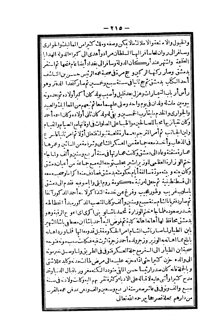 والخيول والامتعة والاملاك مَالا يُمكن وَصفه وَملك كثيرا من المماليك والجوارى وسافر الى روان لما سَافر اليها السُّلْطَان مُرَاد وَأهْدى الى كبراء الدولة الْهَدَايَا الْعَظِيمَة واشتهر عِنْد أَرْكَان الدولة وسافر الى بَغْدَاد أَيْضا عَام فتحهَا ثمَّ اسْتَقر بِدِمَشْق وَصَارَ ركنها الركني وَحج مرّة فى صُحْبَة عَمه الرئيس حسن بن الناشف أحد الْكتاب بِدِمَشْق ثمَّ حج ثَانِيًا فى سنة سبع وَخمسين ثمَّ صَار كتخدا الدفتر وَهُوَ رَأس أَرْبَاب التيمارات وعزل بعد قَلِيل وَأُصِيب بِولد كَانَ أكبر أَوْلَاده ثمَّ بعد مَوته بيومين مَاتَ لَهُ ولدان فى يَوْم وَاحِد وَصلى عَلَيْهِمَا مَعًا ثمَّ تَبِعَهُمْ من المماليك وَالْعَبِيد والجوارى والخدم مَا يُقَارب الْخمسين وبقى لَهُ ولد كَانَ ثانى أَوْلَاده وَكَانَ اسْمه أَحْمد وَكَانَ تقيا نزيها محبا للصالحين مواظبا على الصَّلَوَات فى اوقاتها مَعَ الصّيام وَالْقِيَام ولين الْجَانِب ثمَّ أَمر المترجم بعمارة قلعة تَبُوك فتعلل أَولا ثمَّ امْر ثَانِيًا فاسرع فى الذّهاب وَأخذ مَعَه جمَاعَة من الْعَسْكَر الشامى وشرذمة من البنائين وعمرها عمَارَة متقنة وَعَاد الى دمشق وَكَانَت عمارتها فى سنة أَربع وَسِتِّينَ وَألف وَلما جَاءَ ختم الوزارة الْعُظْمَى للوزير أبشير بحلب توجه اليه مَعَ جمَاعَة من أَعْيَان دمشق وَكَانَ بَينه وَبَينه مَوَدَّة سالفة أَيَّام حكومته بِدِمَشْق فصادف مِنْهُ اكراما وَصَحبه مَعَه الى قسطنيطينية ثمَّ جعل لَهُ رُتْبَة حُكُومَة روم ايلى وايا صوفيه فَقدم الى دمشق باسلوب غَرِيب وطور عَجِيب وَفرغ من خدمَة التذاكر لِابْنِهِ أَحْمد الْمَذْكُور آنِفا ثمَّ صَار دفتريا بِالشَّام سنة سبع وَسِتِّينَ وَألف وَكَانَ المنصب الْمَذْكُور مبدأ انحطاطه بِقدر صُعُوده فَلَمَّا جَاءَ ختم الوزارة لمُحَمد باشا بوينى اكرى اى اعوج الرَّقَبَة وَهُوَ بِدِمَشْق محافظ لَهَا أهانه اهانة كُلية ثمَّ فوض اليه أَحْمد باشا ابْن مصطفى باشا الشهير بِابْن الطيار لماصار نَائِب الشَّام امْر الْحُكُومَة قبل قدومه اليها فَلَمَّا ورد اهانه بابلغ مِمَّا اهانه بِهِ الْوَزير وزجر وَلَده أَحْمد زَجْرَة اثرت فِيهِ فَكَانَت سَبَب مَوته فَتوجه صُحْبَة ابْن الطيار الى السّفر مَعَ جملَة الْعَسْكَر فتوفى فى الطَّرِيق وَلما وصل خبر مَوته الى وَالِده حزن كثيرا حَتَّى اداه حزنه عَلَيْهِ الى مرض طَالَتْ مدَّته وكابد عللا شَتَّى وَبِالْجُمْلَةِ فانه كَانَ صَدرا رَئِيسا حسن الْملقى متوددا لكنه مغرور باقبال الدُّنْيَا وَقد مدح كثيرا وَأثْنى عَلَيْهِ لاقباله على الادباء وَكَثْرَة تقربهم اليه وَكَانَت وِلَادَته فى سنة سبع والف وَتوفى فى عَاشر صفر سنة ارْبَعْ وَسبعين والف وَدفن بمدفن عَمه بِالْقربِ من دَارهم بمحلة قصر حجاج رَحمَه الله تَعَالَى