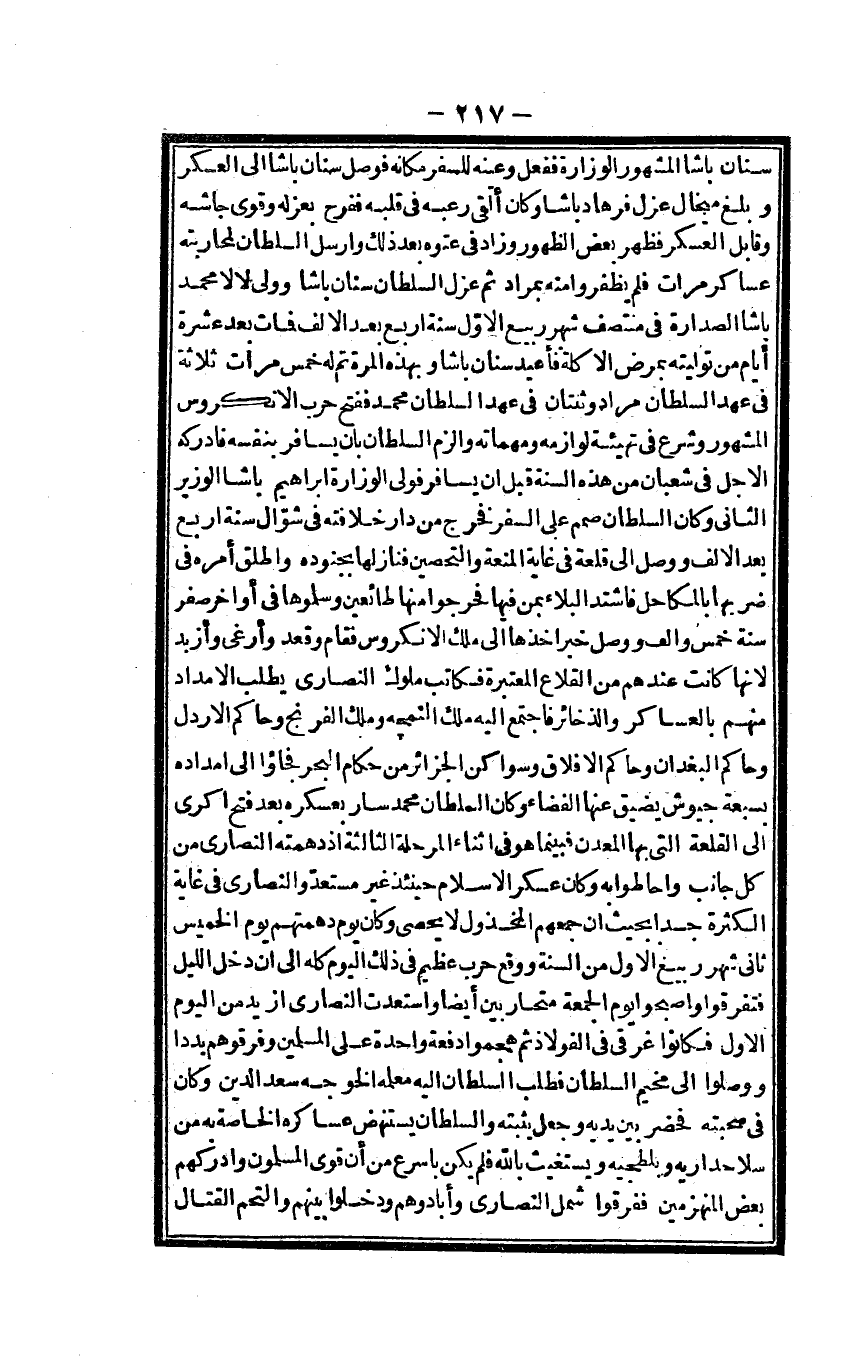 سِنَان باشا الْمَشْهُور الوزارة فَفعل وعينه للسَّفر مَكَانَهُ فوصل سِنَان باشا الى الْعَسْكَر وَبلغ ميخال عزل فرهاد باشا وَكَانَ ألْقى رعبه فى قلبه ففرح بعزله وقوى جاشه وقابل الْعَسْكَر فَظهر بعض الظُّهُور وَزَاد فى عتوه بعد ذَلِك وارسل السُّلْطَان لمحاربته عَسَاكِر مَرَّات فَلم يظفروا مِنْهُ بِمُرَاد ثمَّ عزل السُّلْطَان سِنَان باشا وَولى لَا لَا مُحَمَّد باشا الصدارة فى منتصف شهر بيع الاول سنة ارْبَعْ بعد الالف فَمَاتَ بعد عشرَة أَيَّام من تَوليته بِمَرَض الاكلة فأعيد سِنَان باشا وبهذه الْمرة تمّ لَهُ خمس مَرَّات ثَلَاثَة فى عهد السُّلْطَان مُرَاد وثنتان فى عهد السُّلْطَان مُحَمَّد فَفتح حَرْب الانكروس الْمَشْهُور وَشرع فى تهيئة لوازمه وَمهما والزم السُّلْطَان بَان يُسَافر بِنَفسِهِ فادركه الاجل فى شعْبَان من هَذِه السّنة قبل ان يُسَافر فولى الوزارة ابراهيم باشا الْوَزير الثانى وَكَانَ السُّلْطَان صمم على السّفر فَخرج من دَار خِلَافَته فته فى شَوَّال سنة ارْبَعْ بعد الالف وَوصل الى قلعة فى غَايَة المنعة والتحصين فنازلها بجُنُوده واطلق أمره فى ضربهَا بالمكاحل فَاشْتَدَّ الْبلَاء بِمن فِيهَا فحرجوا مِنْهَا طائعين وسلموها فى أَوَاخِر صفر سنة خمس والف وَوصل خبر اخذها الى ملك الانكروس فَقَامَ وَقعد وأرغى وأزبد لانها كَانَت عِنْدهم من القلاع الْمُعْتَبرَة فكاتب مُلُوك النَّصَارَى يطْلب الامداد مِنْهُم بالعساكر والذخائر فَاجْتمع اليه ملك النمجه وَملك الفرنج وحاكم الاردل وحاكم البغدان وحاكم الافلاق وسواكن الجزائر من حكام الْبَحْر فجاؤا الى امداده بسبعة جيوش يضيق عَنْهَا الفضاء وَكَانَ السُّلْطَان مُحَمَّد سَار بعسكره بعد فتح اكرى كل جَانب واحاطوا بِهِ وَكَانَ عَسْكَر الاسلام حِينَئِذٍ غير مستعد وَالنَّصَارَى فى غَايَة الْكَثْرَة جدا بِحَيْثُ ان جمعهم المخذول لَا يُحْصى وَكَانَ يَوْم دهمتهم يَوْم الْخَمِيس ثانى شهر ربيع الاولى من السّنة وَوَقع حَرْب عَظِيم فى ذَلِك الْيَوْم كُله الى ان دخل اللَّيْل فَتَفَرَّقُوا واصبحوا يَوْم الْجُمُعَة متحاربين أَيْضا واستعدت النَّصَارَى ازيد من الْيَوْم الاول فَكَانُوا غرقى فى الفولاذ ثمَّ هجموا دفْعَة وَاحِدَة على الْمُسلمين وفرقوهم بددا ووصلوا الى مخيم السُّلْطَان فَطلب السُّلْطَان اليه معلمه الخوجه سعد الدّين وَكَانَ فى صحبته فَحَضَرَ بَين يَدَيْهِ وَجعل يُثبتهُ وَالسُّلْطَان يستنهض عساكره الْخَاصَّة بِهِ من سلا حداريه وبلطجيه ويستغيث بِاللَّه فَلم يكن باسرع من أَن قوى الْمُسلمُونَ وادكهم بعض المنهزمين ففرقوا شَمل النَّصَارَى وأبادوهم ودخلوا بَينهم والتحم الْقِتَال