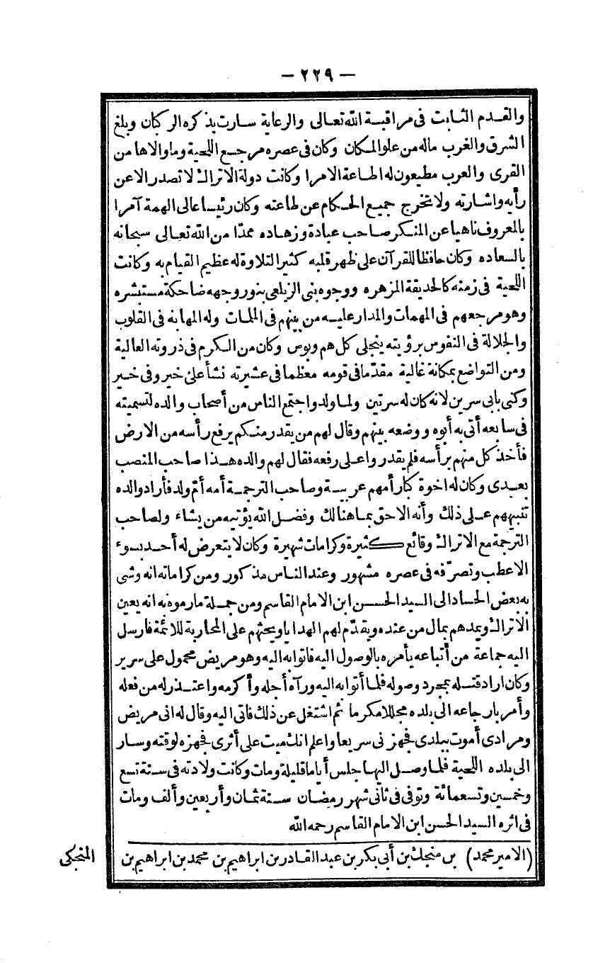 والقدم الثَّابِت فى مراقبة الله تَعَالَى وَالرِّعَايَة سَارَتْ بِذكرِهِ الركْبَان وَبلغ الشرق والغرب مَاله من علو الْمَكَان وَكَانَ فى عصره مرجع اللِّحْيَة وَمَا والاها من اقرى وَالْعرب مطيعون لَهُ اطاعة الامرا وَكَانَت دولة الاتراك لَا تصدر الا عَن رَأْيه واشارته وَلَا تخرج جَمِيع الْحُكَّام عَن طَاعَته وَكَانَ رَئِيسا عالى الهمة آمرا بِالْمَعْرُوفِ ناهيا عَن الْمُنكر صَاحب عبَادَة وزهاده مُمِدًّا من الله تَعَالَى سُبْحَانَهُ بالسعاده وَكَانَ حَافِظًا لِلْقُرْآنِ على ظهر قلبه كثير التِّلَاوَة لَهُ عَظِيم الْقيام بِهِ وَكَانَت اللِّحْيَة فى زَمَنه كالحديقة المزهره ووجوه بنى الزيلعى بِنور وَجهه ضاحكة مستبشره وَهُوَ مرجعهم فى الْمُهِمَّات والمدار عَلَيْهِ من بَينهم فى الملمات وَله المهابة فى الْقُلُوب وَالْجَلالَة فى النُّفُوس بِرُؤْيَتِهِ ينجلى كل هم وبوس وَكَانَ من الْكَرم فى ذروته الْعَالِيَة وَمن التَّوَاضُع بمكانة غَالِيَة مقدما فى قومه مُعظما فى عشيرته نَشأ على خير وفى خير وكنى بابى سِرين لانه كَانَ لَهُ سرتين وَلما ولد وَاجْتمعَ النَّاس من أَصْحَاب وَالِده لتسميته فى سابعه أَتَى بِهِ أَبوهُ وَوَضعه بَينهم وَقَالَ لَهُم من يقدر مِنْكُم يرفع رَأسه من الارض فَأخذ كل مِنْهُم بِرَأْسِهِ فَلم يقدروا على رَفعه فَقَالَ لَهُم وَالِده هَذَا صَاحب المنصب بعدى وَكَانَ لَهُ اخوة كبار أمّهم عَرَبِيَّة وَصَاحب التَّرْجَمَة أمه ام ولد فَأَرَادَ وَالِده تنبيههم على ذَلِك وَأَنه الاحق بِمَا هُنَالك وَفضل الله يؤتيه من يَشَاء وَلِصَاحِب التَّرْجَمَة مَعَ الاتراك وقائع كَثِيرَة وكرامات شهيرة وَكَانَ لَا يتَعَرَّض لَهُ أحد بِسوء الاعطب وتصرفه فى عصره مَشْهُور وَعند النَّاس مَذْكُور وَمن كراماته انه وشى بِهِ بعض الحساد الى السَّيِّد الْحسن ابْن الامام الْقَاسِم وَمن جملَة مَا رَمَوْهُ بِهِ انه يعين الاتراك ويمدهم بِمَال من عِنْده وَيقدم لَهُم الْهَدَايَا ويحثهم على الْمُحَاربَة للائمة فارسل اليه جمَاعَة من أَتْبَاعه يَأْمُرهُ بالوصول اليه فاتوا بِهِ اليه وَهُوَ مَرِيض مَحْمُول على سَرِير وَكَانَ اراد قَتله بِمُجَرَّد وُصُوله فَلَمَّا أَتَوا اليه وَرَآهُ أَجله وأكرمه وَاعْتذر لَهُ من فعله وَأمر بار جاعه الى بَلَده مجللا مكرما ثمَّ اشْتغل عَن ذَلِك فاتى اليه وَقَالَ لَهُ انى مَرِيض ومرادى أَمُوت ببلدى فجهزنى سَرِيعا وَاعْلَم انك ميت على أثرى فجهزه لوقته وَسَار الى بَلَده اللِّحْيَة فَلَمَّا وصل اليها جلس أَيَّامًا قَليلَة وَمَات وَكَانَت وِلَادَته فى سنة تسع وَخمسين وَتِسْعمِائَة وَتوفى فى ثانى شهر رَمَضَان سنة ثَمَان وَأَرْبَعين وَألف وَمَات فى اثره السَّيِّد الْحسن ابْن الإِمَام الْقَاسِم رَحمَه الله
