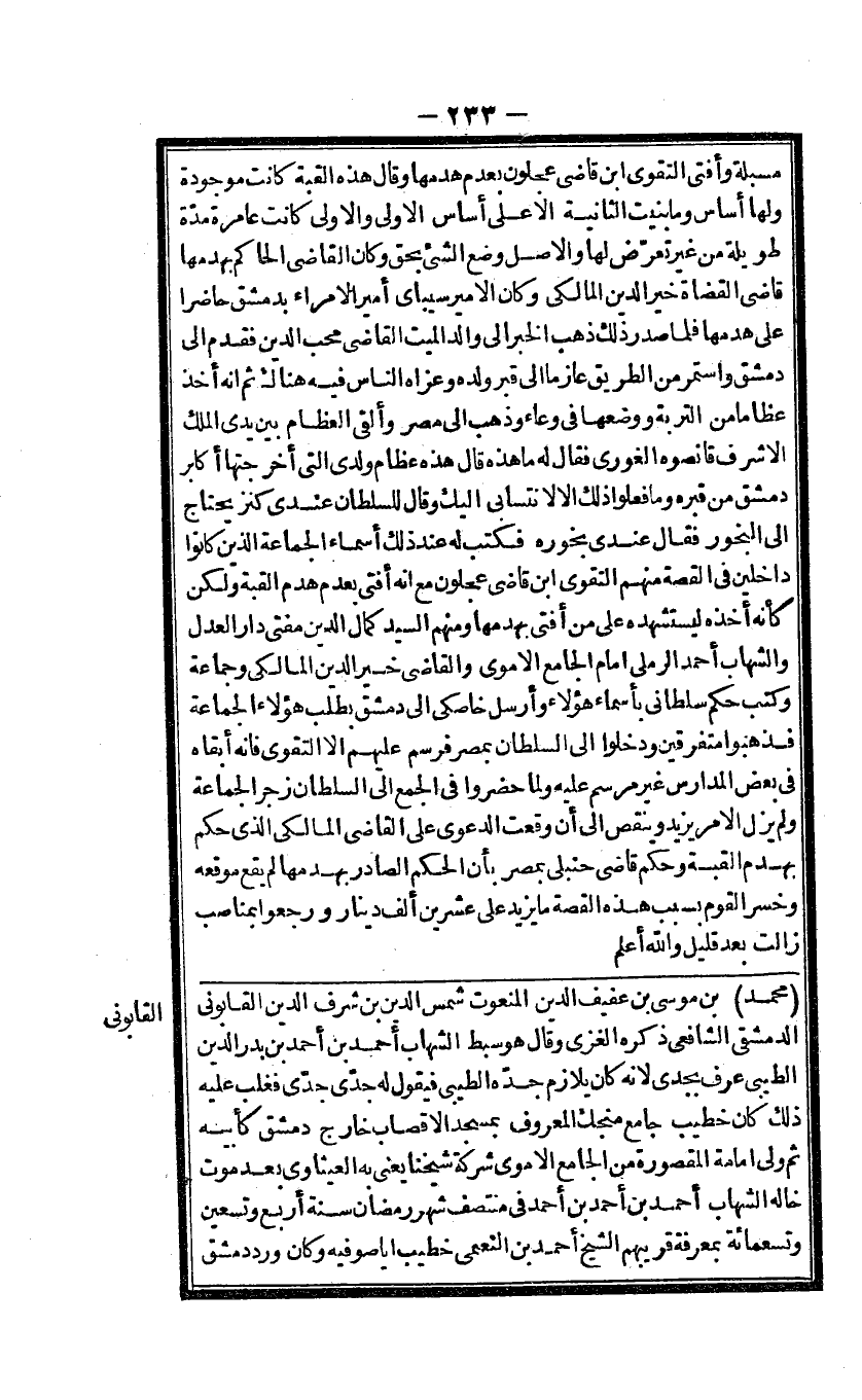 مسبلة وَأفْتى التَّقْوَى ابْن قاضى عجلون بِعَدَمِ هدمها وَقَالَ هَذِه الْقبَّة كَانَت مَوْجُودَة وَلها أساس وَمَا بنيت الثَّانِيَة الا على أساس الاولى والاولى كَانَت عامرة مُدَّة طَوِيلَة من غير تعرض لَهَا والاصل وضع الشئ بِحَق وَكَانَ القاضى الْحَاكِم بهدمها قاضى الْقُضَاة خير الدّين المالكى وَكَانَ الامير سيباى أَمِير الامراء بِدِمَشْق حَاضرا على هدمها فَلَمَّا صدر ذَلِك ذهب الْخَبَر الى وَالِد الْمَيِّت القاضى محب الدّين فَقدم الى دمشق وَاسْتمرّ من الطَّرِيق عَازِمًا الى قبر وَلَده وَعَزاهُ النَّاس فِيهِ هُنَاكَ ثمَّ انه أَخذ عظاما من التربة وَضعهَا فى وعَاء وَذهب الى مصر وَألقى الْعِظَام بَين يدى الْملك الاشرف قانصوه الغورى فَقَالَ لَهُ مَا هَذِه قَالَ هَذِه عِظَام ولدى الَّتِى أخرجتها أكَابِر دمشق من قَبره وَمَا فعلوا ذَلِك الا لانتسابى اليك وَقَالَ للسُّلْطَان عندى كنز يحْتَاج الى البخور فَقَالَ عندى بخوره فَكتب لَهُ عِنْد ذَلِك أَسمَاء الْجَمَاعَة الَّذين كَانُوا داخلين فى الْقِصَّة مِنْهُم التَّقْوَى ابْن قاضى عجلون مَعَ انه أفتى بِعَدَمِ هدم الْقبَّة وَلَكِن كَأَنَّهُ أَخذه ليستشهده على من أفتى بهدمها وَمِنْهُم السَّيِّد كَمَال الدّين مفتى دَار الْعدْل والشهاب أَحْمد الرملى امام الْجَامِع الاموى والقاضى خير الدّين المالكى وَجَمَاعَة وَكتب حكم سلطانى بأسماء هَؤُلَاءِ وَأرْسل خاصكى الى دمشق بِطَلَب هَؤُلَاءِ الْجَمَاعَة فَذَهَبُوا مُتَفَرّقين ودخلوا الى السُّلْطَان بِمصْر فرسم عَلَيْهِم الا التَّقْوَى فانه أبقاه فى بعض الْمدَارِس غير مرسم عَلَيْهِ وَلما حَضَرُوا فى الْجمع الى السُّلْطَان زجر الْجَمَاعَة وَلم يزل الامر يزِيد وَينْقص الى أَن وَقعت الدَّعْوَى على القاضى المالكى الذى حكم بهدم الْقبَّة وَحكم قاضى حنبلى بِمصْر بِأَن الحكم الصَّادِر بهدمها لم يَقع موقعه وخسر الْقَوْم بِسَبَب هَذِه الْقِصَّة مَا يزِيد على عشْرين ألف دِينَار وَرَجَعُوا بمناصب زَالَت بعد قَلِيل وَالله أعلم