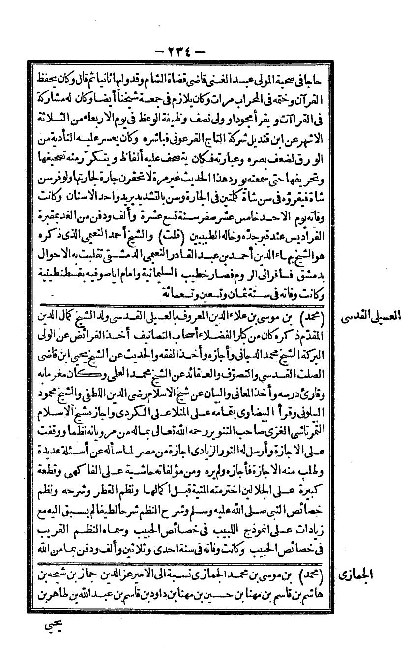 حَاجا فى صُحْبَة الْمولى عبد الْغنى قاضى قُضَاة الشَّام وَقد وَليهَا ثَانِيًا ثمَّ قَالَ وَكَانَ يحفظ الْقُرْآن وختمه فى الْمِحْرَاب مَرَّات وَكَانَ يلازم فى جُمُعَة شَيخنَا أَيْضا وَكَانَ لَهُ مُشَاركَة فى القراآت وَيقْرَأ مجودا ولى نصف وَظِيفَة الْوَعْظ فى يَوْم الاربعاء من الثَّلَاثَة الاشهر عَن ابْن قنديل شركَة التَّاج القرعونى فباشره وَكَانَ يعسر عَلَيْهِ التأدية من الْوَرق لضعف نَصره وَعبارَته فَكَانَ يتصحف عَلَيْهِ أَلْفَاظ ويتكرر مِنْهُ تصحيفها وتحريفها حَتَّى سمعته بورد هَذَا الحَدِيث غير مرّة لَا تحقرن جَارة لجارتها وَلَو فرسن شَاة فيقرؤه فى سنّ شَاة كَلِمَتَيْنِ وَسن بِالتَّشْدِيدِ يُرِيد وَاحِد الاسنان وَكَانَت وَفَاته يَوْم الاحد خَامِس عشر صفر سنة تسع عشرَة وَألف وَدفن من الْغَد بمقبرة الفراديس عِنْد قبر جده وخاله الطيبيين قلت وَالشَّيْخ أَحْمد النعيمى الذى ذكره هُوَ الشَّيْخ بهاء الدّين أَحْمد بن عبد الْقَادِر النعيمى الدمشقى تقلبت بِهِ الاحوال بِدِمَشْق فسافر الى الرّوم فَصَارَ خطيب السليمانية وامام ياصوفيه بقسطنيطينية وَكَانَت وَفَاته فى سنة ثَمَان وَتِسْعين وَتِسْعمِائَة