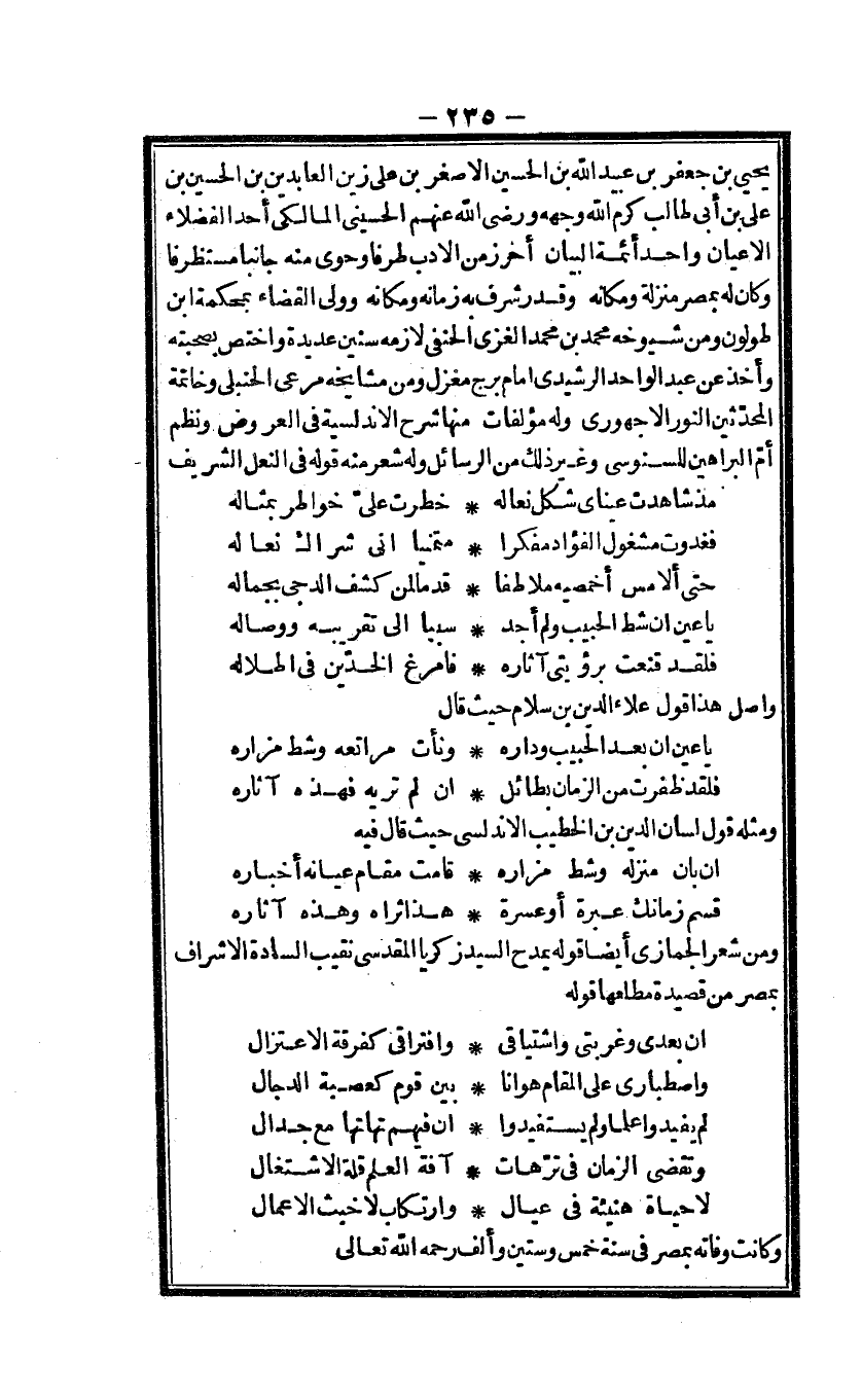 يحيى بن جَعْفَر بن عبيد الله بن الْحُسَيْن الاصغر بن على زين العابدين بن الْحُسَيْن بن على بن أَبى طَالب كرم الله وَجهه ورضى الله عَنْهُم الحسينى المالكى أحد الْفُضَلَاء الاعيان وَاحِد أَئِمَّة الْبَيَان أخر زمن الادب طرفا وحوى مِنْهُ جانبا مستظرفا وَكَانَ لَهُ بِمصْر منزلَة ومكانه وَقدر شرف بِهِ زَمَانه ومكانه وَولى الْقَضَاء بمحكمة ابْن طولون وَمن شُيُوخه مُحَمَّد بن مُحَمَّد الغزى الحنفى لَازمه سِنِين عديدة واختص بِصُحْبَتِهِ وَأخذ عَن عبد الْوَاحِد الرشيدى امام برج مغزل وَمن مشايخه مرعى الحنبلى وخاتمة الْمُحدثين النُّور الاجهورى وَله مؤلفات مِنْهَا شرح الاندلسية فى الْعرُوض ونظم أم الْبَرَاهِين للسنوسى وَغير ذَلِك من الرسائل وَله شعر مِنْهُ قَوْله فى النَّعْل الشريف
