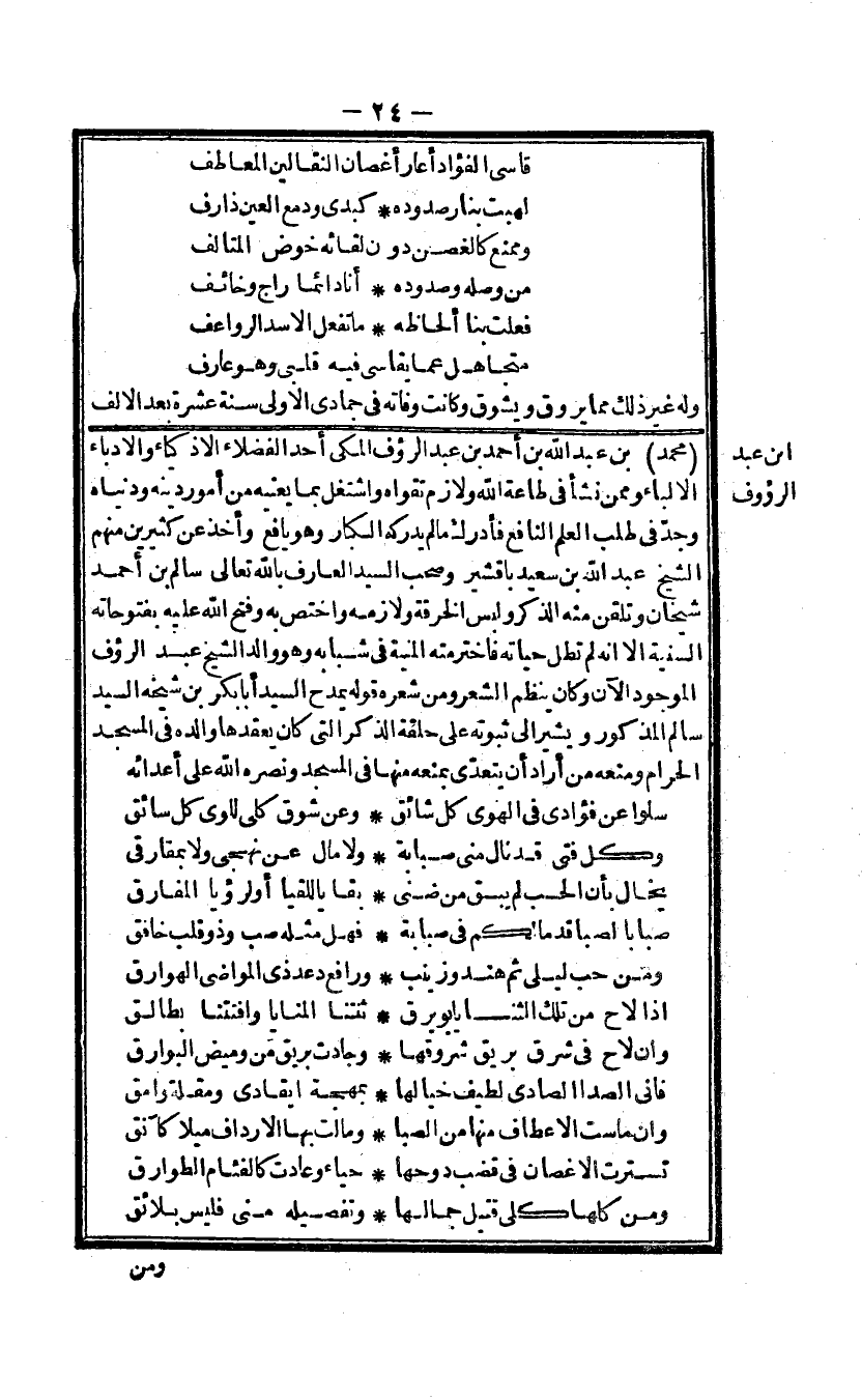 مُحَمَّد بن عبد الله بن أَحْمد بن عبد الرؤف المكى أحد الْفُضَلَاء الاذكياء والادباء الالباء وَمِمَّنْ نَشأ فى طَاعَة الله ولازم تقواه واشتغل بِمَا يعنيه من أموردينه ودنياه وجد فى طلب الْعلم النافع فَأدْرك مَا لم يُدْرِكهُ الْكِبَار وَهُوَ يافع وَأخذ عَن كثيرين مِنْهُم الشَّيْخ عبد الله بن سعيد باقشير وَصَحب السَّيِّد الْعَارِف بِاللَّه تَعَالَى سَالم بن أَحْمد شَيْخَانِ وتلقن مِنْهُ الذّكر وَلبس الْخِرْقَة ولازمه واختص بِهِ وَفتح الله عَلَيْهِ بفتوحاته السّنيَّة الا انه لم تطل حَيَاته فاخترمته الْمنية فى شبابه وَهُوَ وَالِد الشَّيْخ عبد الرؤف الْمَوْجُود الْآن وَكَانَ ينظم الشّعْر وَمن شعره قَوْله يمدح السَّيِّد أَبَا بكر بن شَيْخه السَّيِّد سَالم الْمَذْكُور وَيُشِير الى ثُبُوته على حَلقَة الذّكر الَّتِى كَانَ يعقدها وَالِده فى الْمَسْجِد الْحَرَام وَمنعه من أَرَادَ أَن يتَعَدَّى بِمَنْعه مِنْهَا فى الْمَسْجِد وَنَصره الله على أعدائه