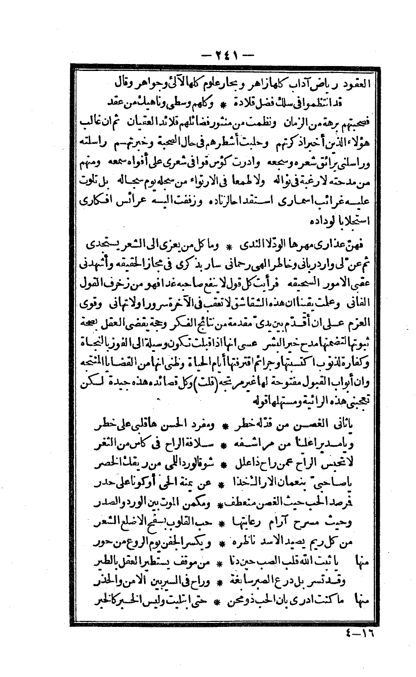 ثمَّ عَن لى وَارِد ربانى وخاطر الهى رحمانى سَار بذكرى فى مجَاز الْحَقِيقَة وأشهدنى عُقبى الامور السحيقه فَرَأَيْت كل قَول لَا ينفع صَاحبه غَدا فَهُوَ من زخرف القَوْل الفانى وَعلمت يَقِينا ان هَذِه الشقاشق لَا تعقب فى الْآخِرَة سرُور وَلَا تهانى وقوى الْعَزْم على ان أقدم بَين يدى مُقَدّمَة من نتائج الْفِكر وَحجَّة يقْضى الْعقل بِصِحَّة ثُبُوتهَا لتضمنها مدح خير الْبشر عَسى انها اذا قبلت تكون وَسِيلَة الى الْفَوْز بالنجاة وَكَفَّارَة لذنوب اكتسبتها وجرائم اقترفتها أَيَّام الْحَيَاة وظنى انها من القضايا المنتجة وان أَبْوَاب الْقبُول مَفْتُوحَة لَهَا غير مرتجة قلت وكل قصائده هَذِه // جَيِّدَة // لَكِن تعجبنى هَذِه الرائية ومستهلها قَوْله