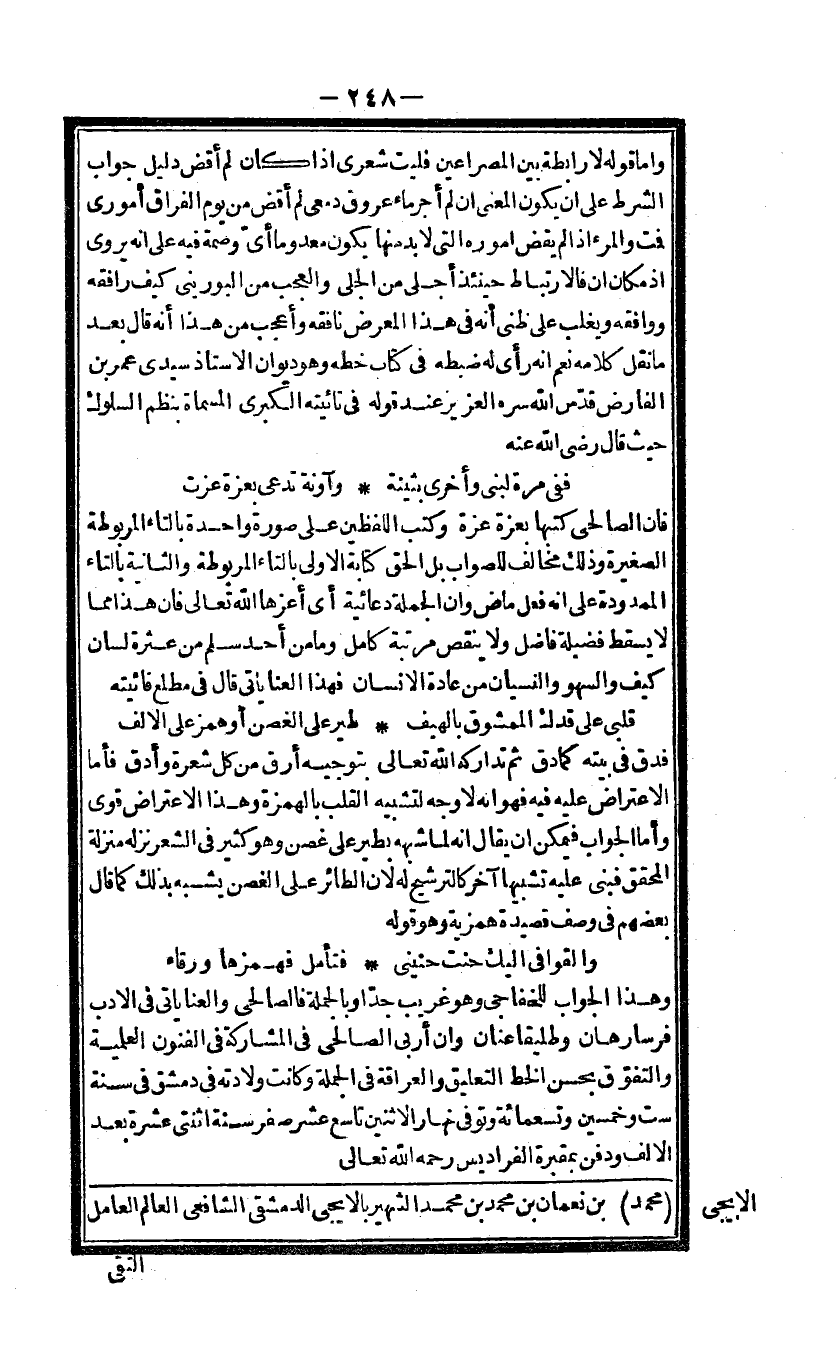 واما قَوْله لَا رابطة بَين المصراعين فليت شعرى اذا كَانَ لم أقض جَوَاب الشَّرْط على ان يكون الْمَعْنى ان لم أجر مَاء عروق دمعى لم أقض من يَوْم الْفِرَاق أمورى فمت والمرء اذا لم يقْض اموره الَّتِى لابد مِنْهَا يكون مَعْدُوما أى وصمة فِيهِ على انه يرْوى اذ مَكَان ان فالارتباط حِينَئِذٍ أجلى من الجلى وَالْعجب من البورينى كَيفَ رافقه وَوَافَقَهُ ويغلب على ظنى أَنه فى هَذَا المعرض نافقه وأعجب من هَذَا أَنه قَالَ بعد مَا نقل كَلَامه نعم انه رأى لَهُ ضَبطه فى كتاب خطه وَهُوَ ديوَان الاستاذ سيدى عمر بن الفارض قدس الله سره الْعَزِيز عِنْد قَوْله فى تائيته الْكُبْرَى الْمُسَمَّاة بنظم السلوك حَيْثُ قَالَ رضى الله عَنهُ