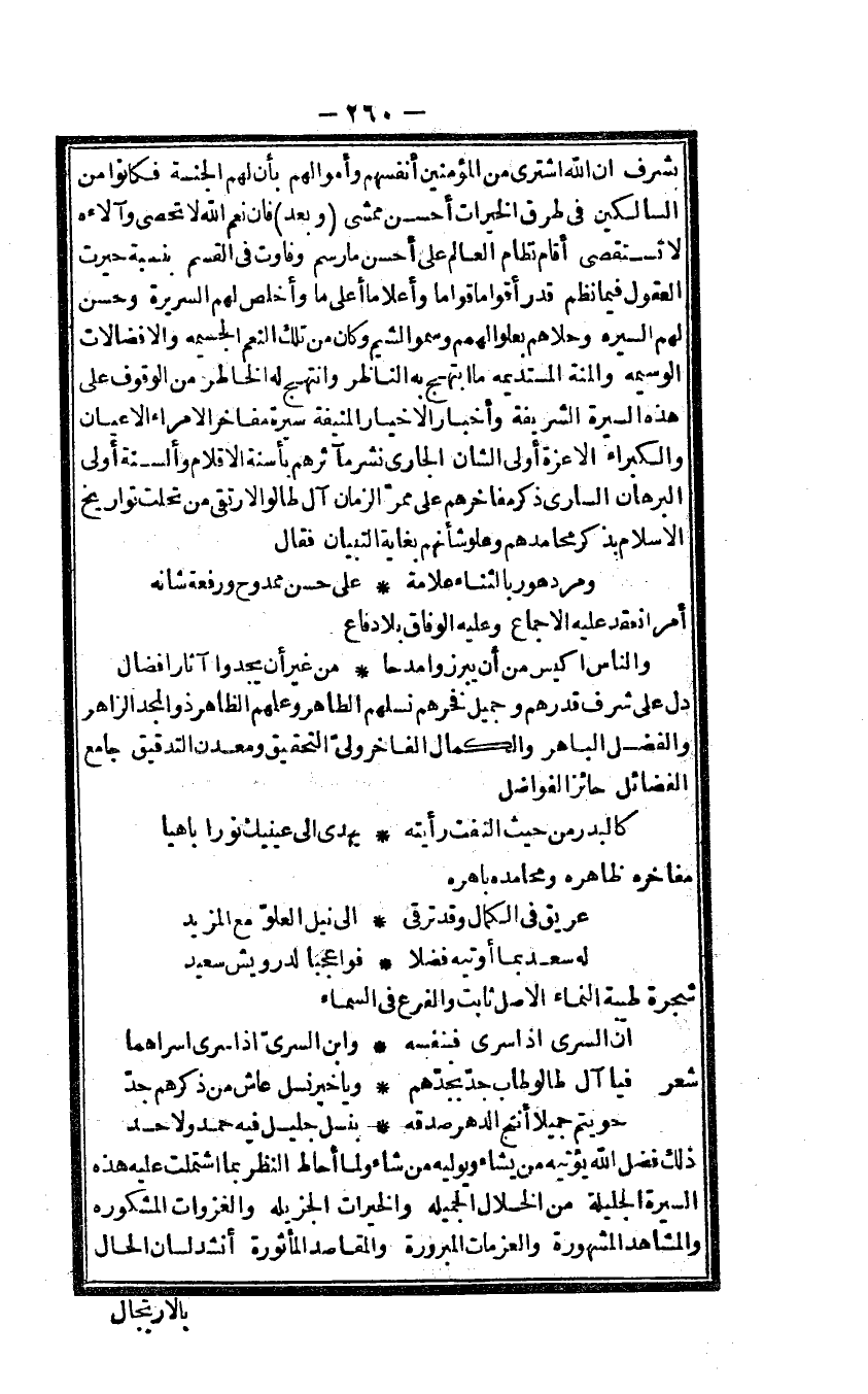 ذَلِك فضل الله يؤتيه من يَشَاء ويوليه من شَاءَ وَلما أحَاط النّظر بِمَا اشْتَمَلت عَلَيْهِ هَذِه السِّيرَة الجليلة من الْخلال الجميله والخيرات الجزيله والغزوات المشكوره والمشاهد الْمَشْهُورَة والعزمات المبرورة والمقاصد المأثورة أنْشد لِسَان الْحَال