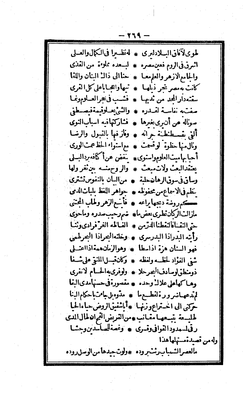 (طوى لآفاق الْبِلَاد ليرى ... لَهُ نظيرا فى الْكَمَال والعلى)