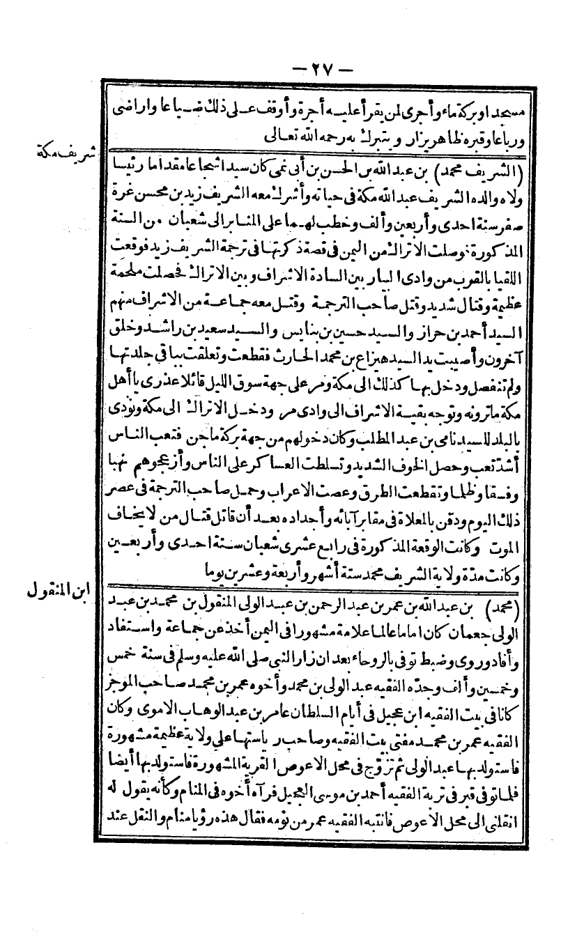 الشريف مُحَمَّد بن عبد الله بن الْحسن بن أَبى نمى كَانَ سيد شجاعا مقداما رَئِيسا ولاه وَالِده الشريف عبد الله مَكَّة فى حَيَاته وأشرك مَعَه الشريف زيد بن محسن غرَّة صفر سنة احدى وَأَرْبَعين وَألف وخطب لَهما على المنابر الى شعْبَان من السّنة الْمَذْكُورَة فوصلت الاتراك من الْيمن فى قصَّة ذكرتها فى تَرْجَمَة الشريف زيد فَوَقَعت اللقيا بِالْقربِ من وادى البيار بَين السَّادة الاشراف وَبَين الاتراك فحصلت ملحمة عَظِيمَة وقتال شَدِيد وَقتل صَاحب التَّرْجَمَة وَقتل مَعَه جمَاعَة من الاشراف مِنْهُم السَّيِّد أَحْمد بن حراز وَالسَّيِّد حُسَيْن بن بنايس وَالسَّيِّد سعيد بن رَاشد وَخلق آخَرُونَ وَأُصِيبَتْ يَد السَّيِّد هيزاع بن مُحَمَّد الْحَارِث فَقطعت وتعلقت بباقى جلدتها وَلم تنفصل وَدخل بهَا كَذَلِك الى مَكَّة وَمر على جِهَة سوق اللَّيْل قَائِلا عذرى يَا أهل مَكَّة مَا تَرَوْنَهُ وَتوجه بَقِيَّة الاشراف الى وادى مر وَدخل الاتراك الى مَكَّة ونودى بِالْبَلَدِ للسَّيِّد نامى بن عبد الْمطلب وَكَانَ دُخُولهمْ من جِهَة بركَة ماجن فتعب النَّاس أَشد تَعب وَحصل الْخَوْف الشَّديد وتسلطت العساكر على النَّاس وأزعجوهم نهبا وفسقا وظلما وتقطعت الطّرق وعصت الاعراب وَحمل صَاحب التَّرْجَمَة فى عصر ذَلِك الْيَوْم وَدفن بالمعلاة فى مَقَابِر آبَائِهِ وأجداده بعد أَن قَاتل قتال من لَا يخَاف الْمَوْت وَكَانَت الْوَقْعَة الْمَذْكُورَة فى رَابِع عشرى شعْبَان سنة احدى وَأَرْبَعين وَكَانَت مُدَّة ولَايَة الشريف مُحَمَّد سِتَّة أشهر وَأَرْبَعَة وَعشْرين يَوْمًا