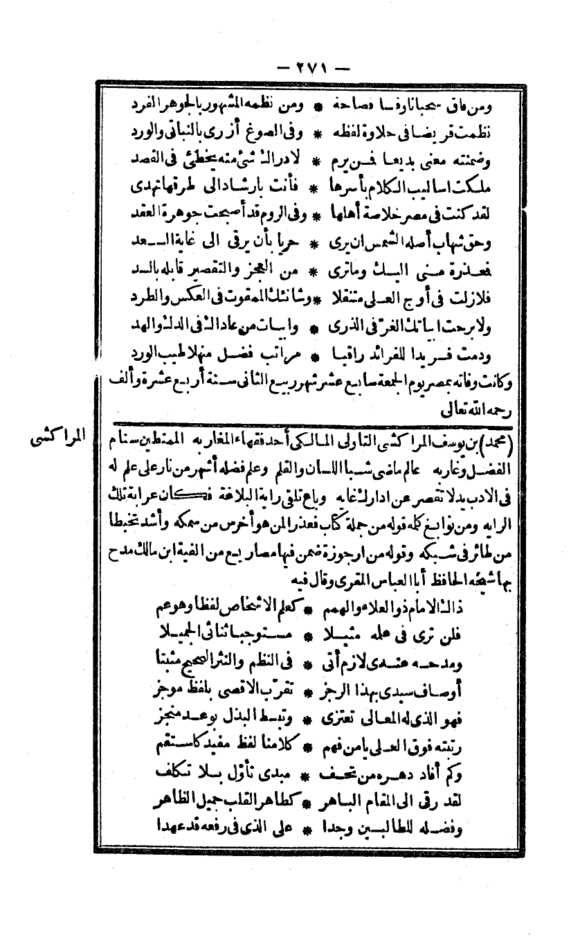 مُحَمَّد بن يُوسُف المراكشى التاولى المالكى أحد فُقَهَاء المغاربه الممتطين سَنَام الْفضل وغاربه عَالم ماضى شبا اللِّسَان والقلم وَعلم فضل أشهر من نَار على علم لَهُ فى الادب يَد لَا تقصر عَن ادارك غايه وَبَاعَ تلقى رياة البلاغة فَكَانَ عرابة تِلْكَ الرايه وَمن نوابغ كَلمه قَوْله من جملَة كتاب فعذر الْمَنّ هُوَ أخرس من سمكه وَأَشد تخبطا من طَائِر فى شبكه وَقَوله من ارجوزة ضمن فِيهَا مصاريع من الفية ابْن مَالك مدح بهَا شَيْخه الْحَافِظ أَبَا الْعَبَّاس المقرى وَقَالَ فِيهِ