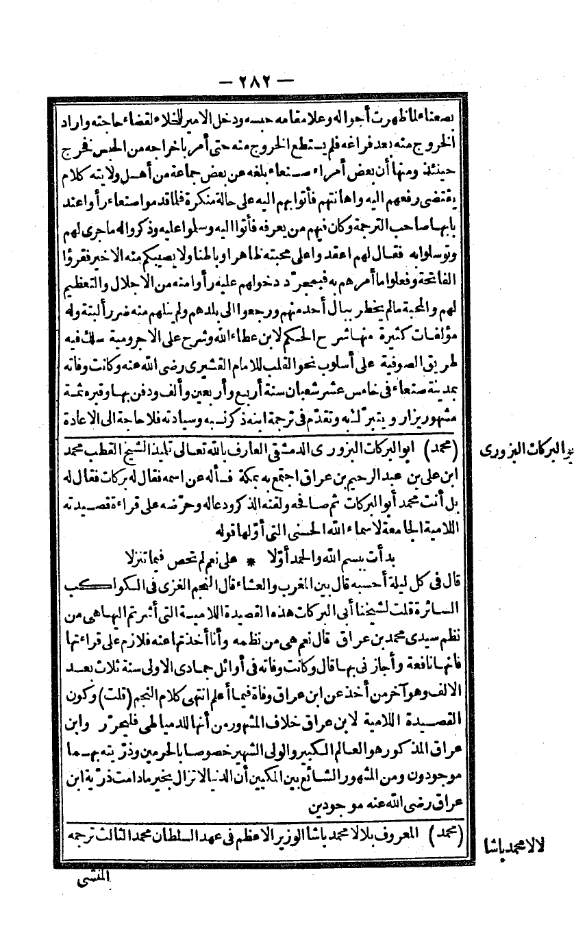 مُحَمَّد ابو البركات البزورى الدمشقى الْعَارِف بِاللَّه تَعَالَى تلميذ الشَّيْخ القطب مُحَمَّد ابْن على بن عبد الرَّحِيم بن عراق اجْتمع بِهِ بِمَكَّة فَسَأَلَهُ عَن اسْمه فَقَالَ لَهُ بَرَكَات فَقَالَ لَهُ بل أَنْت مُحَمَّد أَبُو البركات ثمَّ صافحه ولقنه الذّكر ودعا لَهُ وحرضه على قِرَاءَة قصيدته اللامية الجامعة لاسماء الله الْحسنى الَّتِى أَولهَا قَوْله