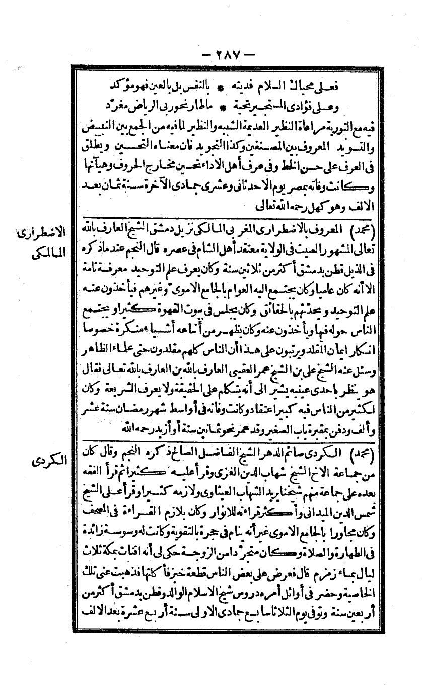 مُحَمَّد الْمَعْرُوف بالاضطرارى المغربى المالكى نزيل دمشق الشَّيْخ الْعَارِف بِاللَّه تَعَالَى الْمَشْهُور الصيت فى الْولَايَة مُعْتَقد أهل الشَّام فى عصره قَالَ النَّجْم عِنْد مَا ذكره فى الذيل قطن بِدِمَشْق أَكثر من ثَلَاثِينَ سنة وَكَانَ يعرف علم التَّوْحِيد معرفَة تَامَّة الا أَنه كَانَ عاميا وَكَانَ يجْتَمع اليه الْعَوام بالجامع الاموى وَغَيرهم فَيَأْخُذُونَ عَنهُ علم التَّوْحِيد ويحدثهم بالحقائق وَكَانَ يجلس فى بيُوت القهوة كثيرا ويجتمع النَّاس حوله فِيهَا وَيَأْخُذُونَ عَنهُ وَكَانَ يظْهر من أَتْبَاعه أَشْيَاء مُنكرَة خُصُوصا انكار ايمان الْمُقَلّد ويرتبون على هَذَا أَن النَّاس كلهم مقلدون حَتَّى عُلَمَاء الظَّاهِر وَسُئِلَ عَنهُ الشَّيْخ على بن الشَّيْخ عمر العقبى الْعَارِف بِاللَّه بن الْعَارِف بِاللَّه تَعَالَى فَقَالَ هُوَ ينظر باحدى عَيْنَيْهِ يُشِير الى أَنه يتَكَلَّم على الْحَقِيقَة وَلَا يعرف الشَّرِيعَة وَكَانَ لكثير من النَّاس فِيهِ كَبِير اعْتِقَاد وَكَانَت وَفَاته فى أواسط شهر رَمَضَان سنة عشر وَألف وَدفن بمقبرة بَاب الصَّغِير وَقد عمر نَحْو ثَمَانِينَ سنة أَو أَزِيد رَحمَه الله