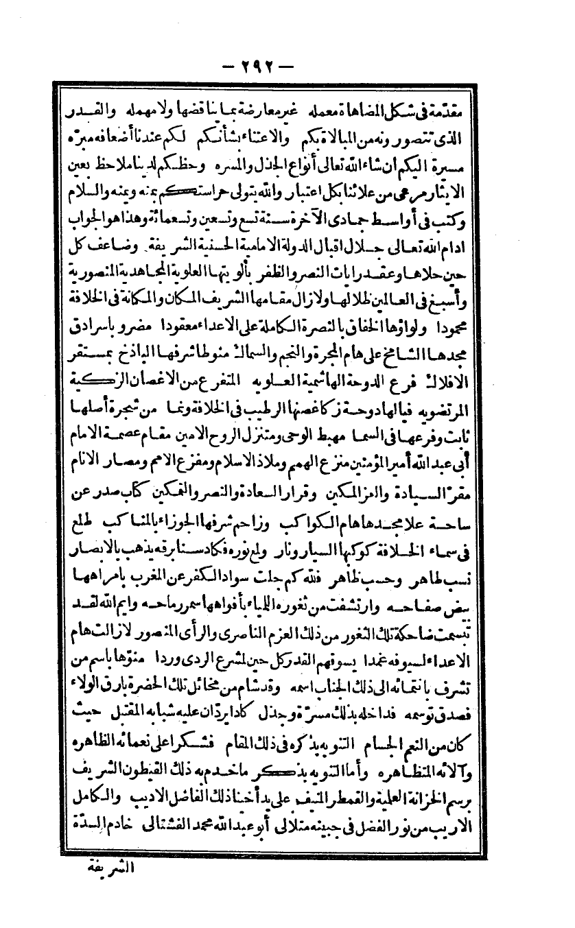 مُقَدّمَة فى شكل المضاهاة معمله غير مُعَارضَة بِمَا يناقضها وَلَا مهمله وَالْقدر الذى تتصورونه من المبالاة بكم والاعتناء بشأنكم لكم عندنَا أضعافه مبره مسيرَة اليكم أَن شَاءَ الله تَعَالَى أَنْوَاع الجذل والمسره وحظكم لدينا ملاحظ بِعَين الايثار مرعى من علائنا بِكُل اعْتِبَار وَالله يتَوَلَّى حراستكم بمنه ويمنه وَالسَّلَام وَكتب فى أواسط جُمَادَى الْآخِرَة سنة تسع وَتِسْعين وَتِسْعمِائَة وَهَذَا هُوَ الْجَواب ادام الله تَعَالَى جلال اقبال الدولة الامامية الحسنية الشَّرِيفَة وضاعف كل حِين حلاها وَعقد رايات النَّصْر وَالظفر بألويتها العلوية المجاهدية المنصورية وأسبغ فى الْعَالمين ظلالها وَلَا زَالَ مقَامهَا الشريف الْمَكَان والمكانة فى الْخلَافَة مَحْمُودًا ولواؤها الخفاق بالنصرة الْكَامِلَة على الاعداء معقودا مَضْرُوبا سرادق مجدها الشامخ على هام المجرة والنجم والسماك مَنُوطًا شرفها الباذخ بمستقر الافلاك فرع الدوحة الهاشمية العلوية المتفرع من الاغصان الزكية المرتضويه فيا لَهَا دوحة زكا غصنها الرطيب فى الْخلَافَة ونما من شَجَرَة أَصْلهَا ثَابت وفرعها فى السما مهبط الوحى ومتنزل الرّوح الامين مقَام عصمَة الامام ابى عبد الله أَمِير الْمُؤمنِينَ منزع الهمم وملاذ الاسلام ومفزع الامم ومصار الانام مقرّ السِّيَادَة والعز المكين وقرار السَّعَادَة والنصر والتمكين كتاب صدر عَن ساحة علا مجدها هام الْكَوَاكِب وزاحم شرفها الجوزاء بالمناكب طلع فى سَمَاء الْخلَافَة كوكبها السيار ونار ولمع نوره فكاد سنا برقه يذهب بالابصار نسب طَاهِر وَحسب ظَاهر فَللَّه كم جلت سَواد الْكفْر عَن الْمغرب بامراهها بيض صفاحه وارتشفت من ثغوره اللمياء بأفواهها سمر رماحه وَايْم الله لقد تبسمت ضاحكة تِلْكَ الثغور من ذَلِك الْعَزْم الناصرى والرأى الْمَنْصُور لَا زَالَت هام الاعداء لسيوفه غمدا يسوقهم الْقدر كل حِين لمشرع الردى وردا منوها باسم من تشرف بانتمائه الى ذَلِك الجناب اسْمه وَقد شام من مخائل تِلْكَ الحضرة بارق الْوَلَاء فَصدق توسمه فداخله بذلك مَسَرَّة وجذل كادا يردان عَلَيْهِ شبابه المقتبل حَيْثُ كَانَ من النعم الجسام التنويه بِذكرِهِ فى ذَلِك الْمقَام فشكرا على نعمائه الظاهره وآلائه المتظاهره وَأما التنويه بِذكر مَا خدم بِهِ ذَلِك القيطون الشريف برسم الخزانة العلمية والقمطر المنيف على يَد أخينا ذَلِك الْفَاضِل الاديب والكامل الاريب من نور الْفضل فى جَبينه متلألىء أَبُو عبد الله مُحَمَّد الفشتالى خَادِم السدة