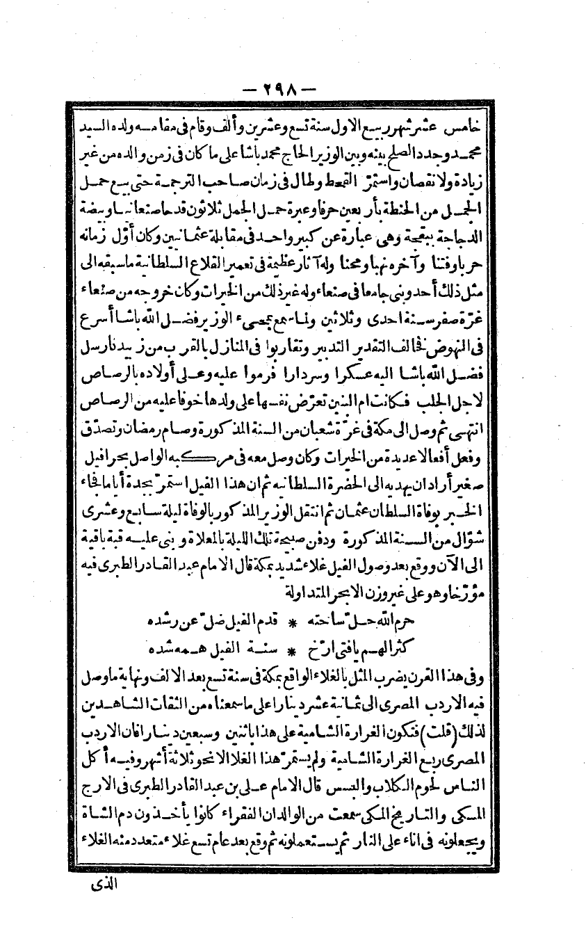 وفى هَذَا الْقرن يضْرب الْمثل بالغلاء الْوَاقِع بِمَكَّة فى سنة تسع بعد الالف وَنِهَايَة مَا وصل فِيهِ الاردب المصرى الى ثَمَانِيَة عشر دِينَارا على مَا سمعناه من الثِّقَات الشَّاهِدين لذَلِك قلت فَتكون الغرارة الشامية على هَذَا بِاثْنَيْنِ وَسبعين دِينَارا فان الاردب المصرى ربع الغرارة الشامية وَلم يسْتَمر هَذَا الغلا الا نَحْو ثَلَاثَة أشهر وَفِيه أكل النَّاس لُحُوم الْكلاب والبسس قَالَ الامام على بن عبد الْقَادِر الطبرى فى الارج المكى والتاريخ المسكى سَمِعت من الْوَالِدَان الْفُقَرَاء كَانُوا يَأْخُذُونَ دم الشَّاة ويجعلونه فى اناء على النَّار ثمَّ يستعملونه ثمَّ وَقع بعد عَام تسع غلاء مُتَعَدد مِنْهُ الغلاء