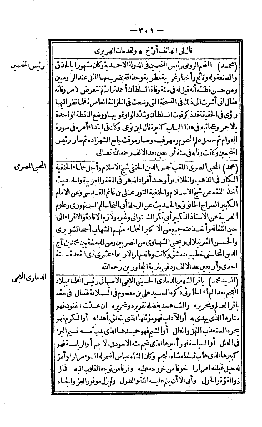 مُحَمَّد المنجم الرومى رَئِيس المنجمين فى الدولة الاحمدية وَكَانَ مَشْهُورا بالحذق والصنعة وَله وقائع وأخبار غَرِيبَة مطربة وحذاقة يضْرب بهَا الْمثل عِنْد الروميين وَمن حسن فطنته أَنه قيل لَهُ فى سنة وَفَاة السُّلْطَان أَحْمد نرَاك لم تتعرض لامر وَفَاته فَقَالَ انى أَشرت الى ذَلِك فى النُّسْخَة الَّتِى وضعت فى الخزانة العامرة فَلَمَّا نظر اليها رؤى فى الْحَقِيقَة قد ذكر فَوت السُّلْطَان وشدد الْوَاو وتمويها وَوضع النقطة الْوَاحِدَة بالاحمر وعجائبه فى هَذَا الْبَاب كَثِيرَة قَالَ ابْن نوعى وَكَانَ فى ابْتِدَاء أمره فى صُورَة الْعَوام ثمَّ حصل علم النُّجُوم وَمهر فِيهِ وَصَارَ موقت جَامع الشهزاده ثمَّ صَار رَئِيس المنجمين وَكَانَت وَفَاته فى سنة أَرْبَعِينَ بعد الالف رَحمَه الله تَعَالَى