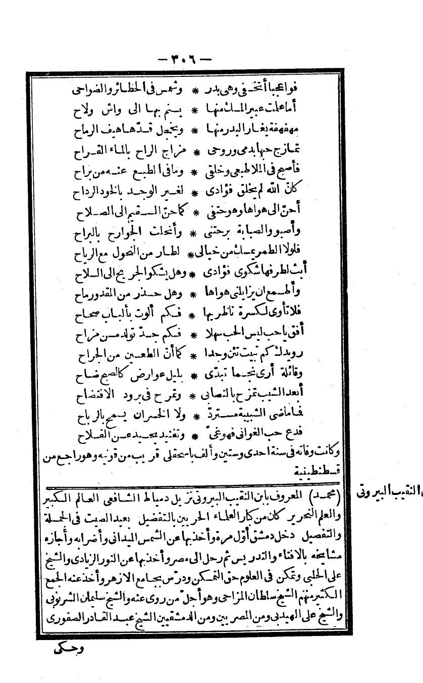 مُحَمَّد الْمَعْرُوف بِابْن النَّقِيب البيرونى نزيل دمياط الشافعى الْعَالم الْكَبِير وَالْعلم النحرير كَانَ من كبار الْعلمَاء الحريين بالتفضيل بعيد الصيت فى الْجُمْلَة وَالتَّفْصِيل دخل دمشق أول مرّة وَأخذ بهَا عَن الشَّمْس الميدانى وَأَضْرَابه وَأَجَازَهُ مشايخه بالافتاء والتدريس ثمَّ رَحل الى مصر وَأخذ بهَا عَن النُّور الزيادى وَالشَّيْخ على الحلبى وَتمكن فى الْعُلُوم حق التَّمَكُّن ودرس بِجَامِع الازهر وَأخذ عَنهُ الْجمع الْكثير مِنْهُم الشَّيْخ سُلْطَان المزاحى وَهُوَ أجل من روى عَنهُ وَالشَّيْخ سُلَيْمَان الشرنوبى وَالشَّيْخ على الهيدبى وَمن المصريين وَمن الدمشقيين الشَّيْخ عبد الْقَادِر الصفورى