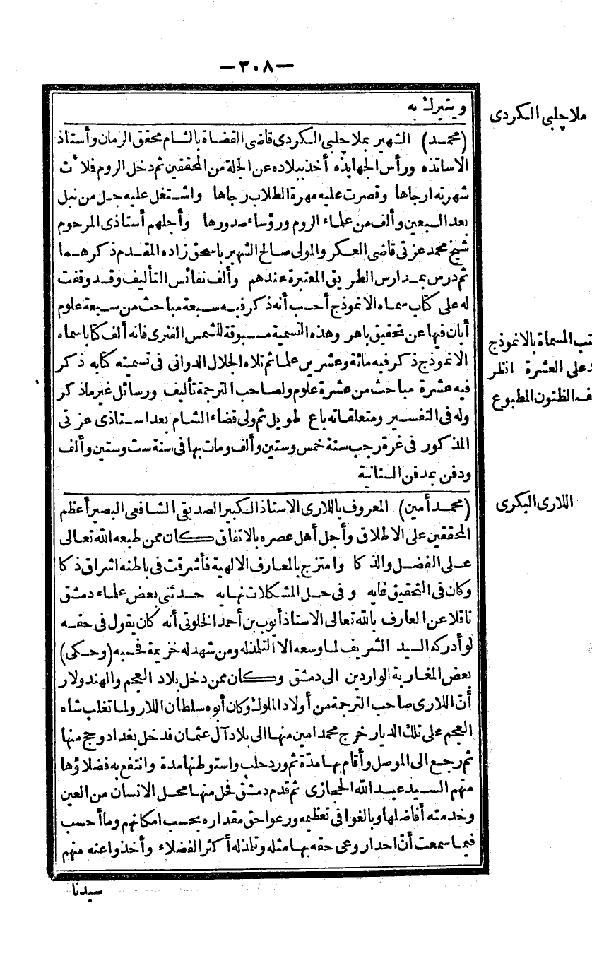 مُحَمَّد أَمِين الْمَعْرُوف بالارى الاستاذ الْكَبِير الصديقى الشافعى الْبَصِير أعظم الْمُحَقِّقين على الاطلاق وَأجل أهل عصره بالِاتِّفَاقِ كَانَ مِمَّن طبعه الله تَعَالَى على الْفضل والذكا وامتزج بالمعارف الالهية فأشرقت فى بَاطِنه اشراق ذكا وَكَانَ فى التَّحْقِيق غايه وفى حل المشكلات نهايه حَدَّثَنى بعض عُلَمَاء دمشق نَاقِلا عَن الْعَارِف بِاللَّه تَعَالَى الاستاذ أَيُّوب بن أَحْمد الخلوتى أَنه كَانَ يَقُول فى حَقه لَو أدْركهُ السَّيِّد الشريف لما وَسعه الا التلمذ لَهُ وَمن شهد لَهُ خُزَيْمَة فحسبه وَحكى بعض المغاربة الواردين الى دمشق وَكَانَ مِمَّن دخل بِلَاد الْعَجم والهند ولار أَن اللارى صَاحب التَّرْجَمَة من أَوْلَاد الْمُلُوك وَكَانَ أَبوهُ السُّلْطَان اللار وَلما تغلب شاه الْعَجم على تِلْكَ الديار خرج مُحَمَّد امين مِنْهَا الى بِلَاد آل عُثْمَان فَدخل بَغْدَاد وَحج مِنْهَا ثمَّ رَجَعَ الى الْموصل وَأقَام بهَا مُدَّة ثمَّ ورد حلب واستوطنها مُدَّة وانتفع بِهِ فضلاؤها مِنْهُم السَّيِّد عبد الله الحجازى ثمَّ قدم دمشق فَحل مِنْهَا مَحل الانسان من الْعين وخدمته أفاضلها وبالغوا فى تَعْظِيمه ورعوا حق مِقْدَاره بِحَسب امكانهم وَمَا أَحسب فِيمَا سَمِعت أَن احدا روعى حَقه بهَا مثله وتلمذ لَهُ أَكثر الْفُضَلَاء وَأخذُوا عَنهُ مِنْهُم