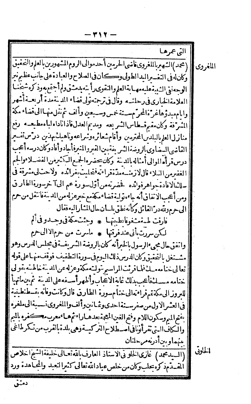 مُحَمَّد الشهير بالملغروى قالضى الْحَرَمَيْنِ أحد موالى الرّوم الْمَشْهُورين بِالْعلمِ وَالتَّحْقِيق وَكَانَ لَهُ فى التَّفْسِير الْيَد الطُّولى وَكَانَ فى الصّلاح وَالْعِبَادَة على جَانب عَظِيم نير الْوَجْه نقى الشيبة عَلَيْهِ مهابة الْعلم وَالتَّقوى رَأَيْته بِدِمَشْق وَلم أجتمع بِهِ وَذكره شَيخنَا الْعَلامَة الخيارى فى رحلته وَقَالَ فى تَرْجَمته تولى قَضَاء الْمَدِينَة مُدَّة أَرْبَعَة أشهر وايام مبدؤها غرَّة الْمحرم سنة خمس وَسبعين وَألف ثمَّ نقل مِنْهَا الى قَضَاء مَكَّة المشرفة وَكَانَ مُقيم قسطاس الشريعه ومديم الْعدْل فاذا ناداه لباه مطيعه رفع منَازِل الْعلم بالبلدين المحترمين وَأقَام شعائره وشراعه وناهيك بِهَذَيْنِ درس تَفْسِير القاضى البيضاوى بالروضة الشريفية بَين الْقَبْر والمنبر فأجاد وَأفَاد وَكَانَ درسه أعجب درس قَرَأَهُ الموالى أَمْثَاله بِالْمَدِينَةِ وَكَانَ يحضرهُ الْجمع الْكثير من الْفُضَلَاء والجم الْغَفِير من النبلاء قَالَا لازمته قِرَاءَته فتحليت بفرائده ولاحت لى مشرقة فى سلك الافادة جَوَاهِر فَوَائده فحضرته من أول سُورَة عَم الى آخر سُورَة الطارق وَمن أعجب الِاتِّفَاق أَنه جَاءَهُ تَوْلِيَة قَضَاء مَكَّة مَعَ خبر عَزله من الْمَدِينَة فانتقل من حرم الى حرم وَللَّه در الْقَائِل وَكَأَنَّهُ نطبق بِلِسَان حَال الْمشَار اليه فَقَالَ