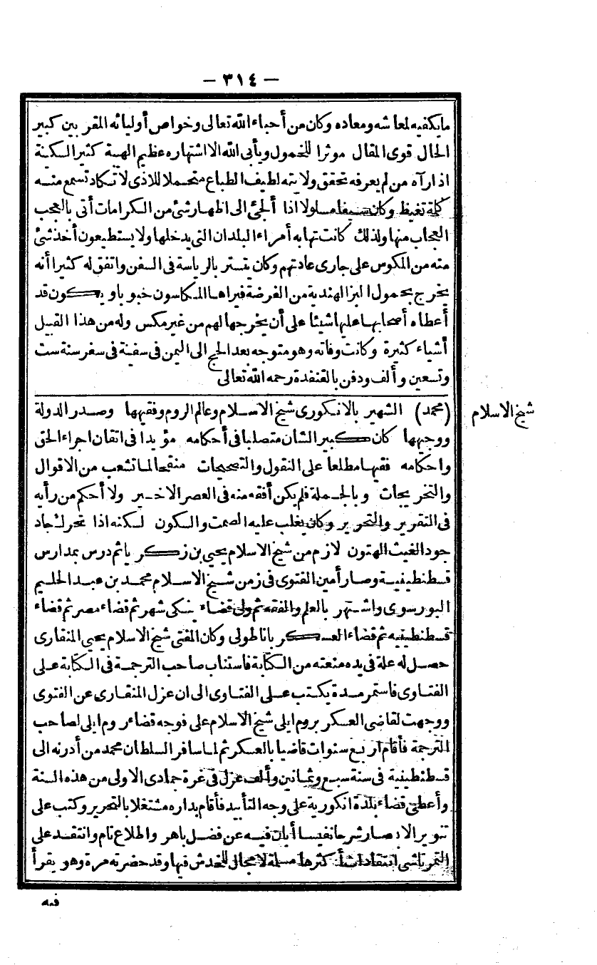 مُحَمَّد الشهير بالانكورى شيخ الاسلام وعالم الرّوم وفقيهها وَصدر الدولة ووجيهها كَانَ كَبِير الشان متصلبا فى أَحْكَامه مؤيدا فى اتقان اجراء الْحق وَأَحْكَامه فَقِيها مطلعا على النقول والتصحيحات منقحا لما تشعب من الاقوال والتخريجات وَبِالْجُمْلَةِ فَلم يكن أفقه مِنْهُ فى الْعَصْر الاخير وَلَا أحكم من رَأْيه فى التَّقْرِير والتحرير وَكَانَ يغلب عَلَيْهِ الصمت والسكون لكنه اذا تحرّك جاد جود الْغَيْث الهتون لَازم من شيخ الاسلام يحيى بن زَكَرِيَّا ثمَّ درس بمدارس قسطنطينية وَصَارَ أَمِين الْفَتْوَى فى زمن شيخ الاسلام مُحَمَّد بن عبد الْحَلِيم البورسوى واشتهر بِالْعلمِ وَالْفِقْه ثمَّ ولى قَضَاء ينكى شهر ثمَّ قَضَاء مصر ثمَّ قَضَاء قسطنطينية ثمَّ قَضَاء الْعَسْكَر باناطولى وَكَانَ الْمُفْتى شيخ الاسلام يحيى المنقارى حصل لَهُ عِلّة فى يَده منعته من الْكِتَابَة فاستناب صَاحب التَّرْجَمَة فى الْكِتَابَة على الْفَتَاوَى فاستمر مُدَّة يكْتب على الْفَتَاوَى الى ان عزل المنقارى عَن الْفَتْوَى ووجهت لقاضى الْعسر بروم ايلى شيخ الاسلام على فَوجه قَضَاء روم ايلى لصَاحب التَّرْجَمَة فَأَقَامَ ارْبَعْ سنوات قَاضِيا بالعسكر ثمَّ لما سَافر السُّلْطَان مُحَمَّد من أدرنه الى قسطنطينية فى سنة سبع وَثَمَانِينَ وَألف عزل فى غرَّة جُمَادَى الاولى من هَذِه السّنة وَأعْطى قَضَاء بَلْدَة انكورية على وَجه التَّأْبِيد فَأَقَامَ بداره مشتغلا بالتحرير وَكتب على تنوير الابصار شرحا نفيسا أبان فِيهِ عَن فضل باهر واطلاع تَامّ وانتقد على التمرتاشى انتقادات أَكْثَرهَا مسلمة لَا مجَال للخدش فِيهَا وَقد حَضرته مرّة وَهُوَ يقْرَأ